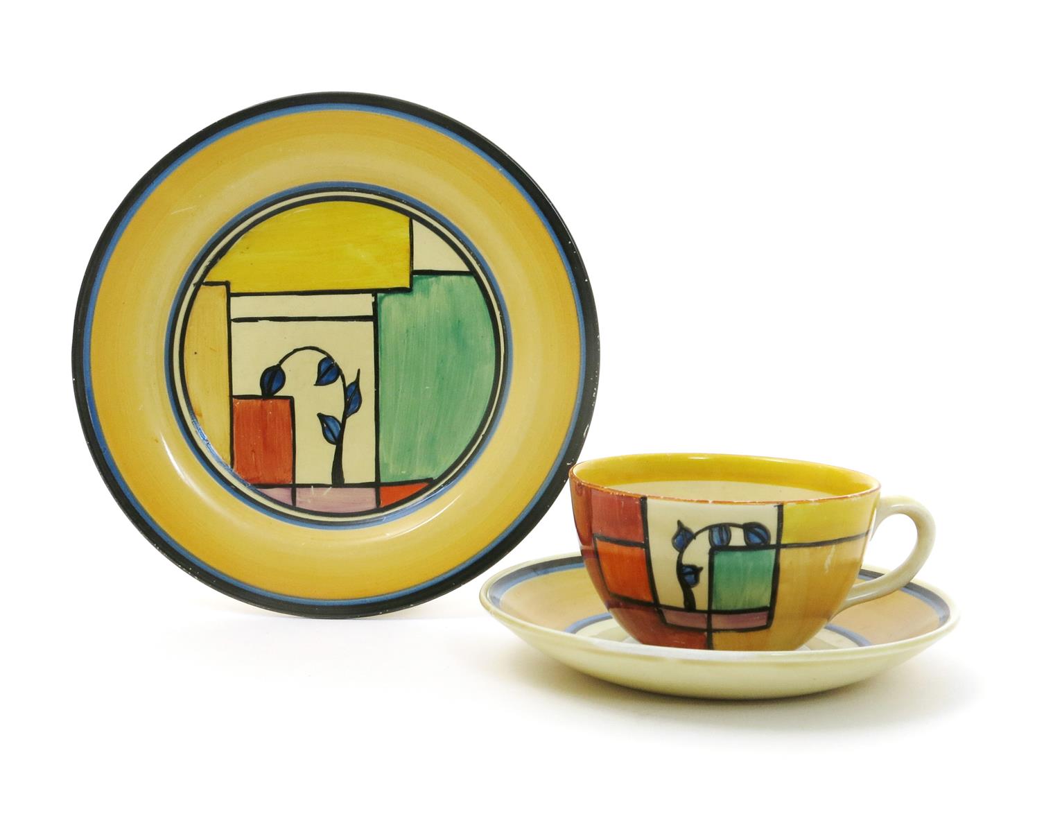 'Branch and Squares' a Clarice Cliff Bizarre Globe tea cup saucer and side plate, painted in colours inside yellow, blue and black bands, printed factory marks, 17.5cm. diam. (3)