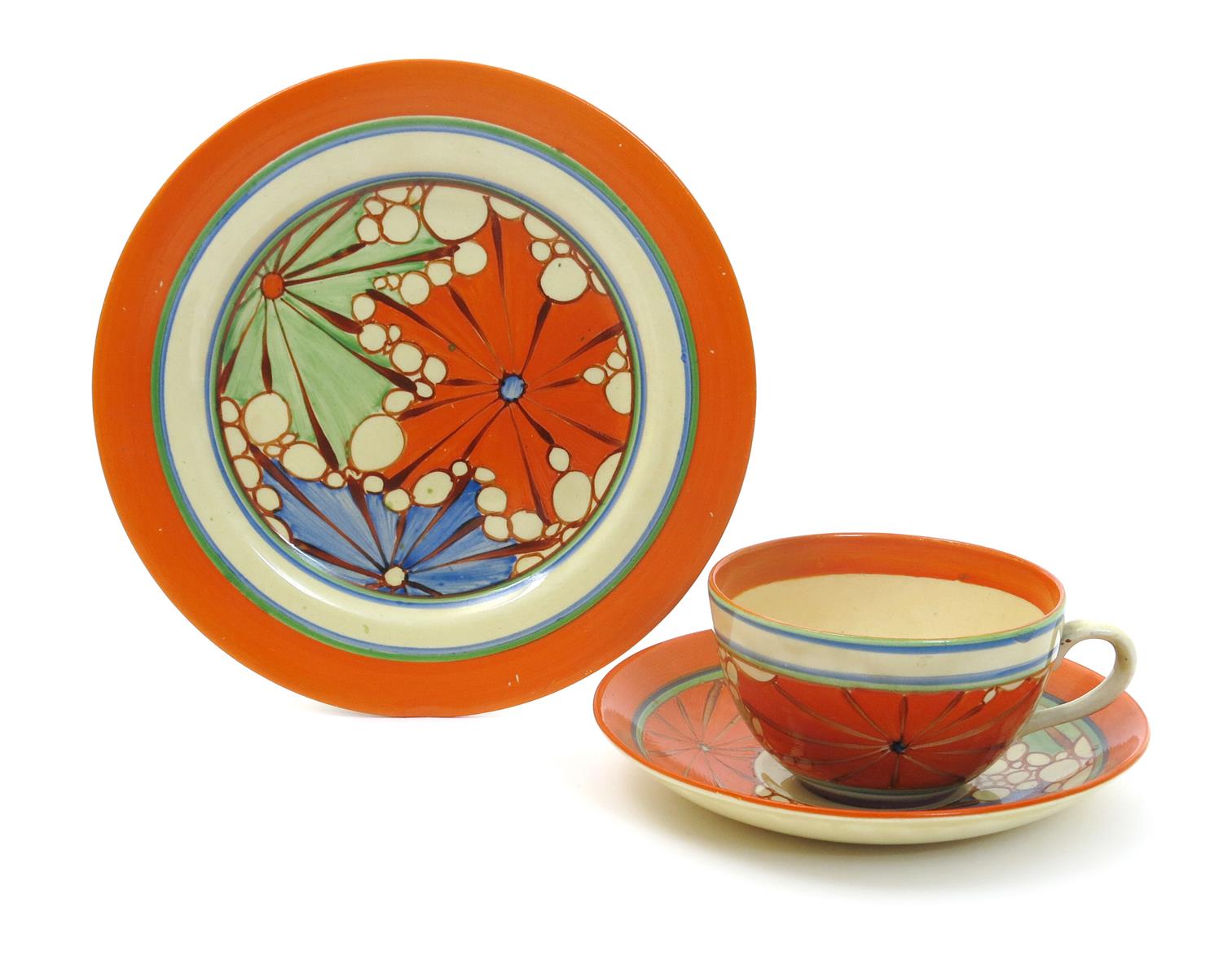 'Broth' a Clarice Cliff Bizarre Globe cup, saucer and side plate, painted in colours printed factory marks, professional restoration to cup, 17.5cm. diam. (3)