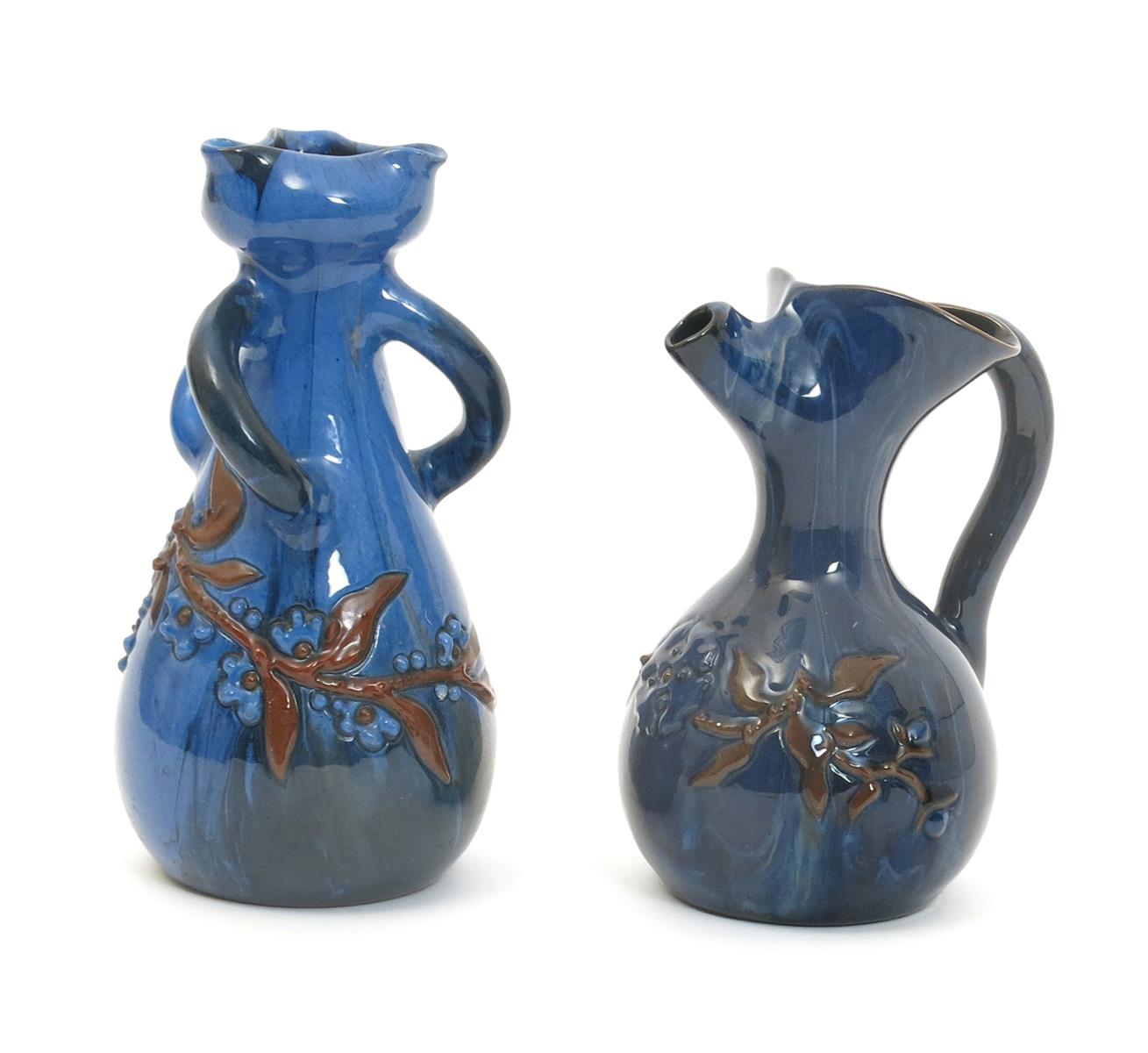 A Sunflower Pottery vase designed by Sir Edmund Elton, ovoid with flaring cylindrical neck, slip decorated with foliage in blue and green on a streaked blue and green ground, another similar and a tall Sunflower pottery vase covered in a green and blue marbled glaze, and a Sunflower Pottery ewer and a vase, painted marks, restored chip to top rim of small vase, 18.5cm. high, (5)