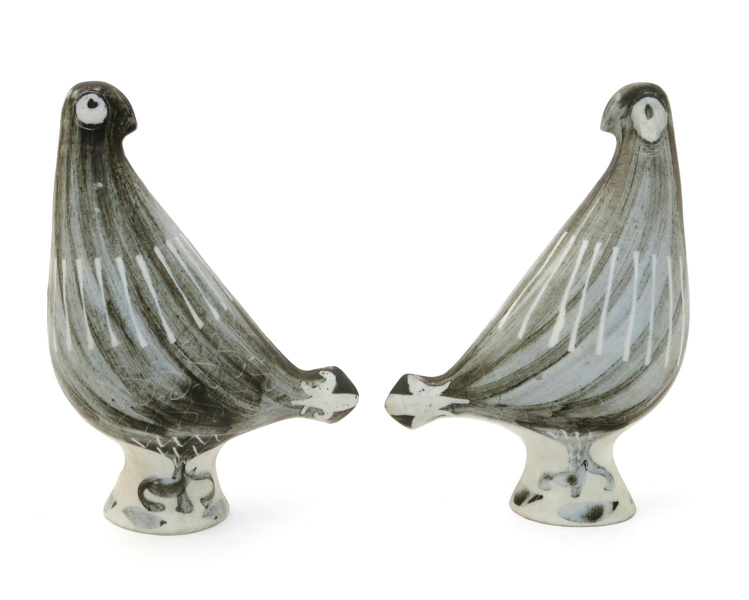 A pair of Richard Parkinson Pottery hens designed by Susan Parkinson, painted in grey, impressed marks, 25cm. high (2)
