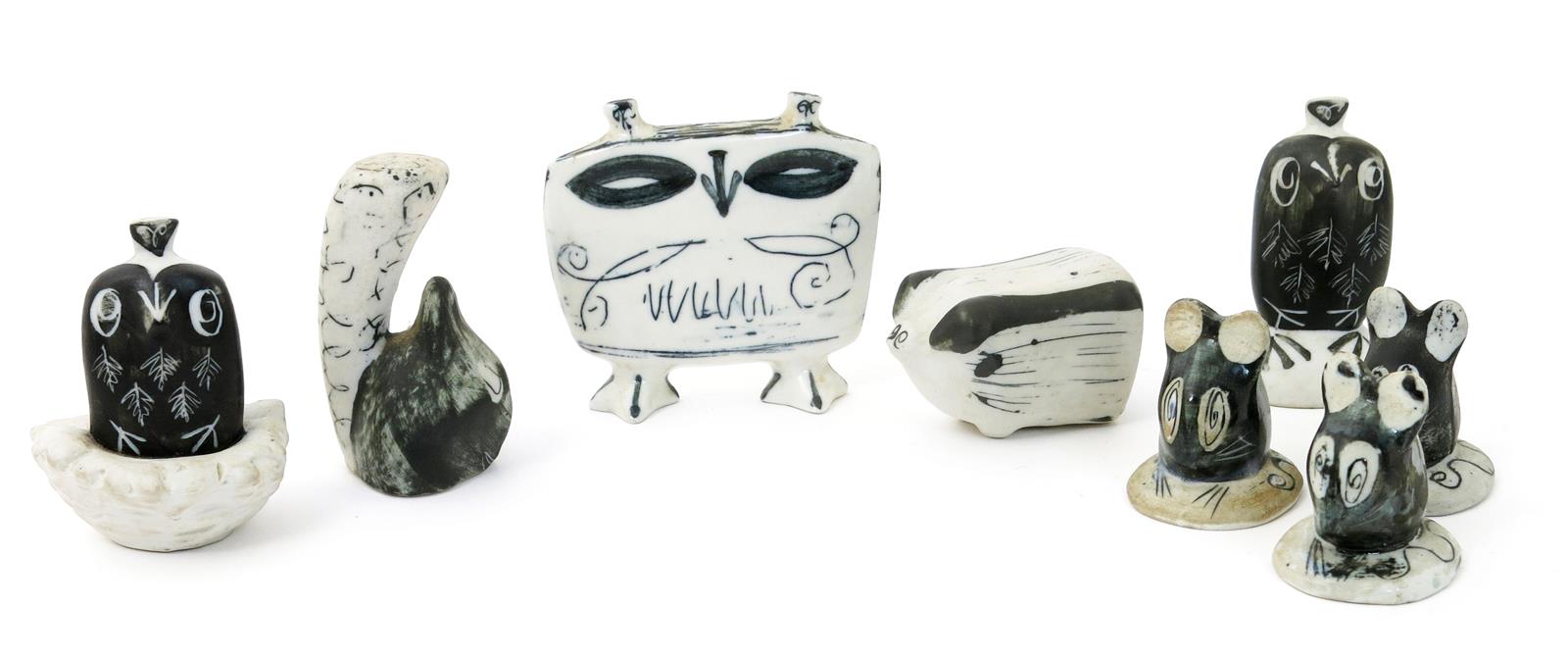 A Richard Parkinson Pottery owl designed by Susan Parkinson, painted in blue-black, an owl on a nest and another owl, three mice, a pig and a squirrel, some impressed marks, 7.5cm. high, (8)