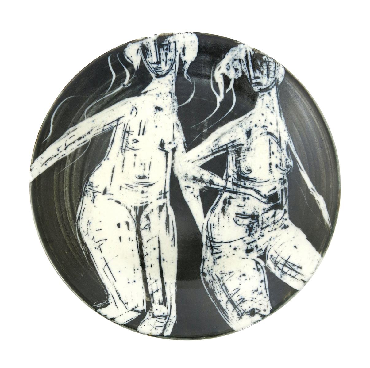 A Richard Parkinson Pottery plate designed by Susan Parkinson, painted in blue-black with two naked women, unmarked, 21.5cm. diam.