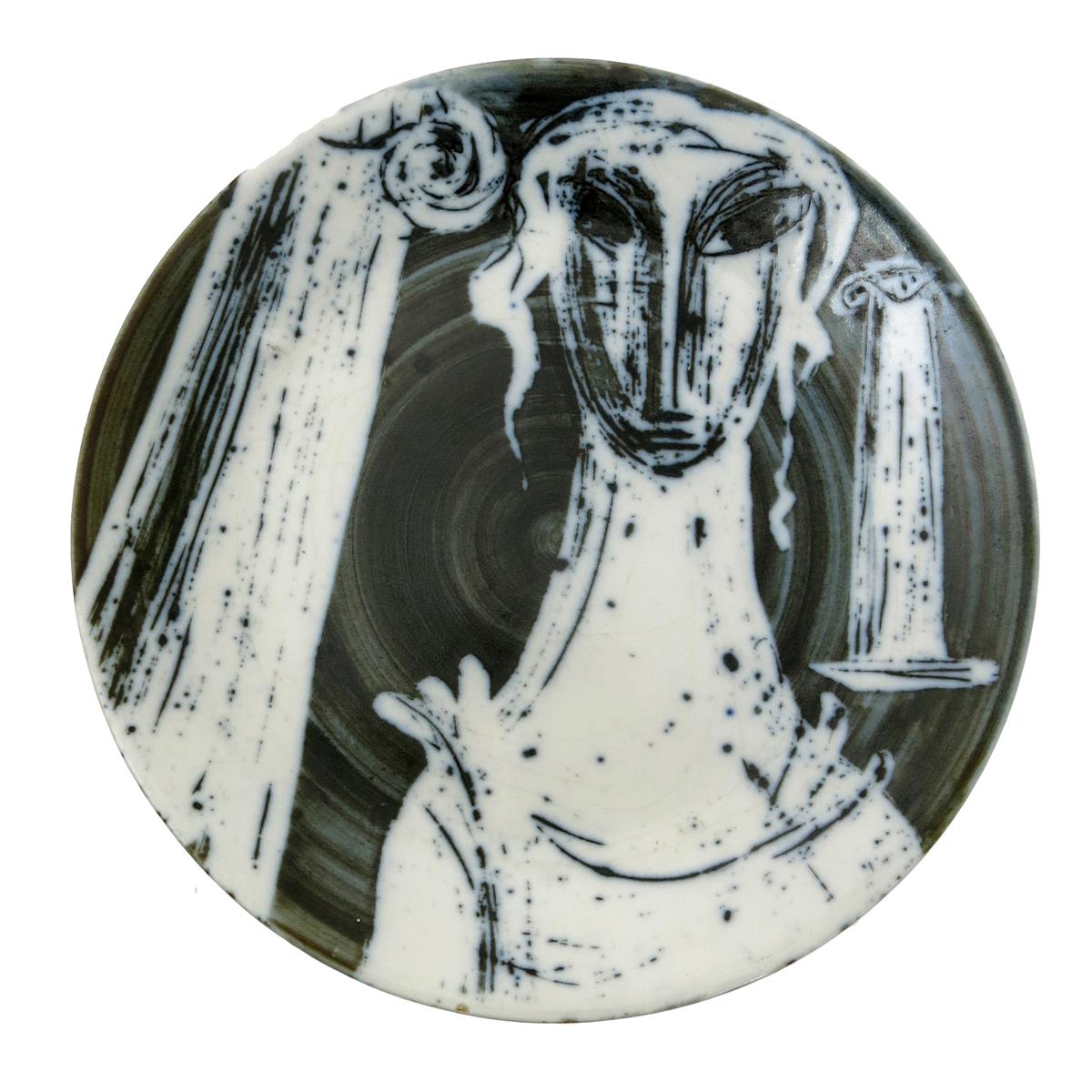A Richard Parkinson Pottery plate designed by Susan Parkinson, painted in blue-black with a classical maiden standing between two Ionic pillars, impressed marks, 21.5cm. diam.