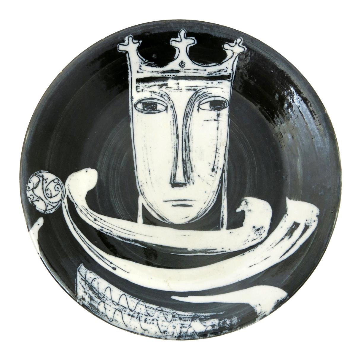 A Richard Parkinson Pottery King plate from the Chess Series designed by Susan Parkinson, painted in black, impressed factory marks, 21.5cm. diam.