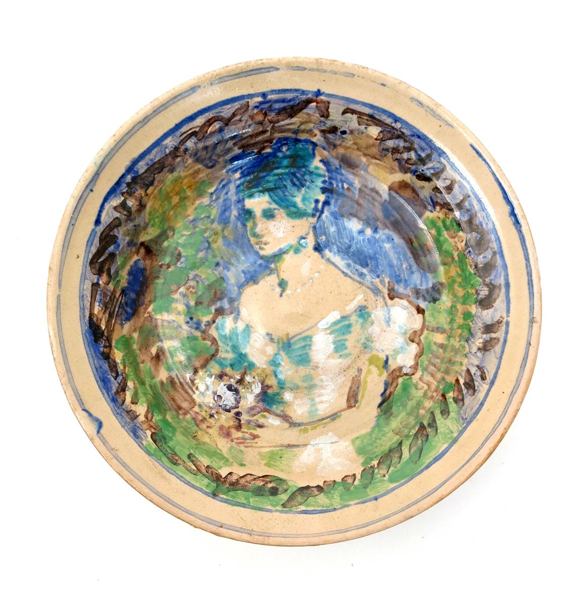 a Fulham Pottery plate, painted with a seated woman portrait, in colours unsigned, 27cm. diam.