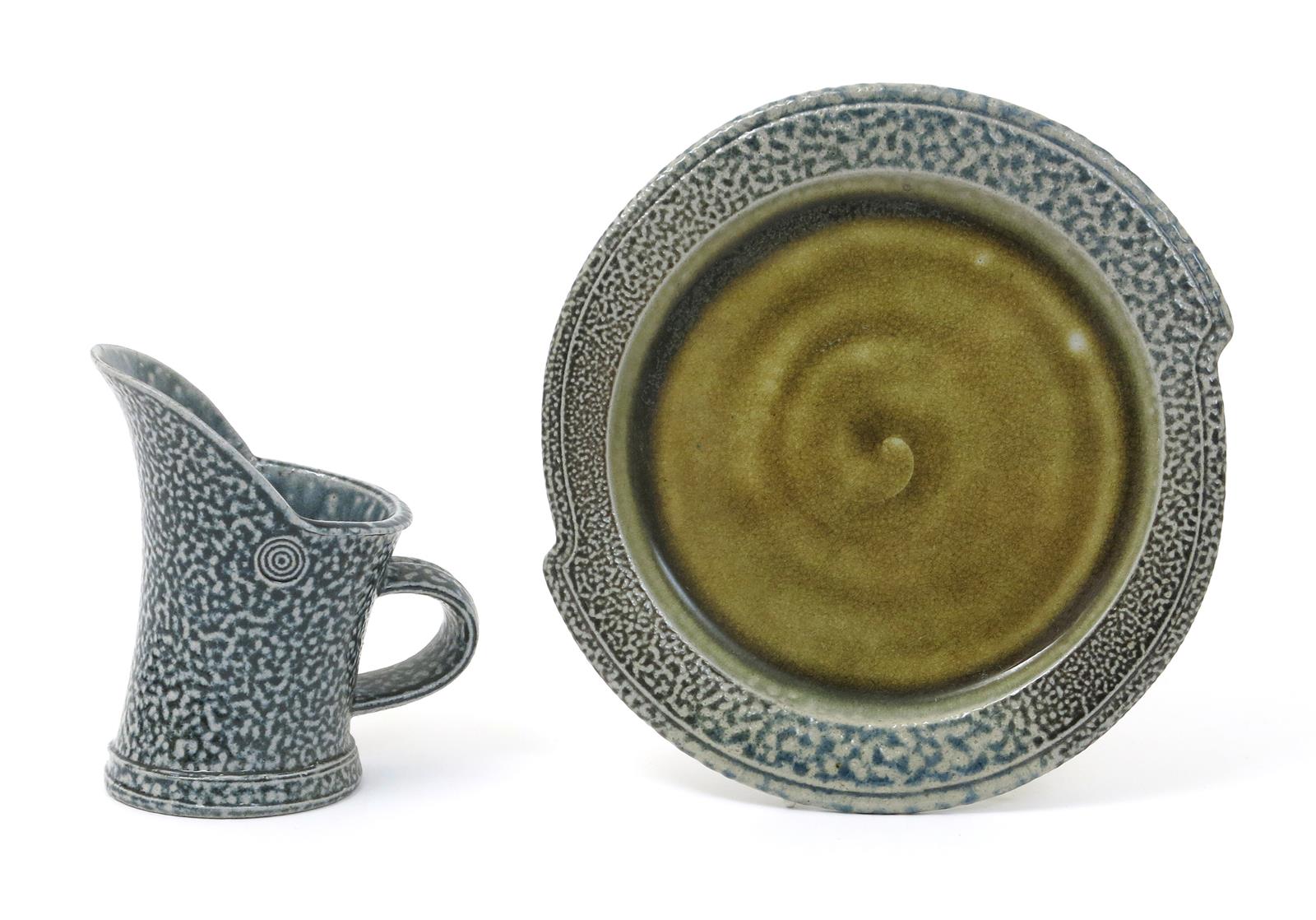 a salt-glazed stoneware jug, cylindrical form with loop handle, covered in a blue glaze, and a plate by Walter Keeler, impressed seal marks, 12.5cm. high (jug), (2)
