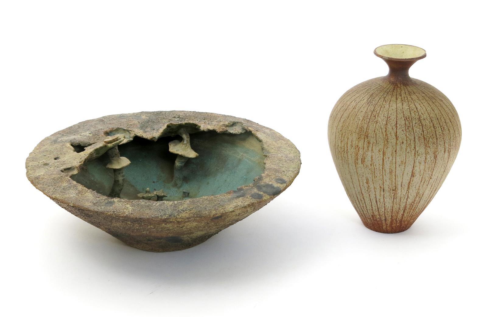 a stoneware vase, shouldered form with narrow solifleur neck, painted vertical line decoration, a low flaring organic sculpture by Sheila Fournier, a bottle vase by Robert 'Bob' Waddell, Gordonstoun School, 1963, and a collection of studio pottery impressed seal marks, chip to Cooper vase, 25.5cm. diam. (a lot)