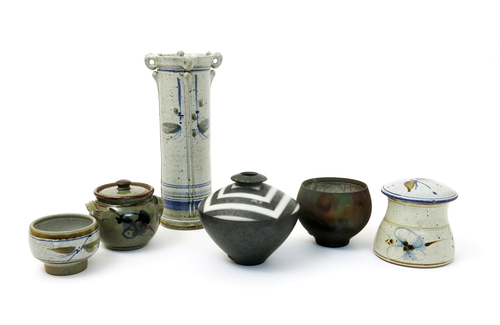 a Raku humbug vase, the shoulder decorated with black and white geometric design, another Tim Andrews burnished raku vase, two covered pots and two vases, impressed seal marks, 15cm. high (6)
