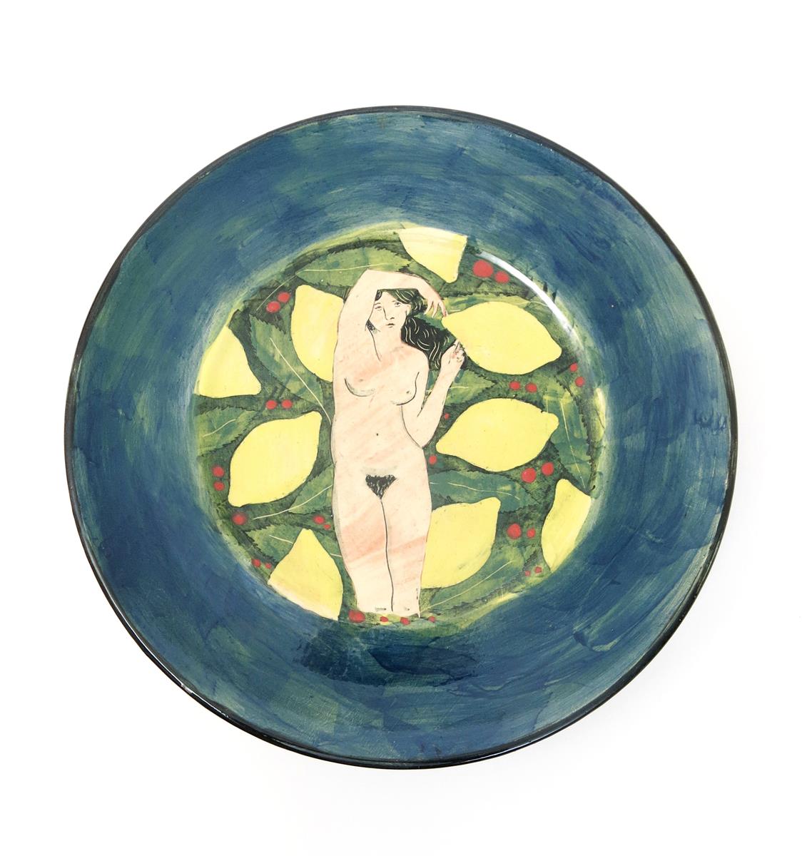 ‡ Sophie MacCarthy an earthenware charger painted with a naked maiden before lemons and berried...