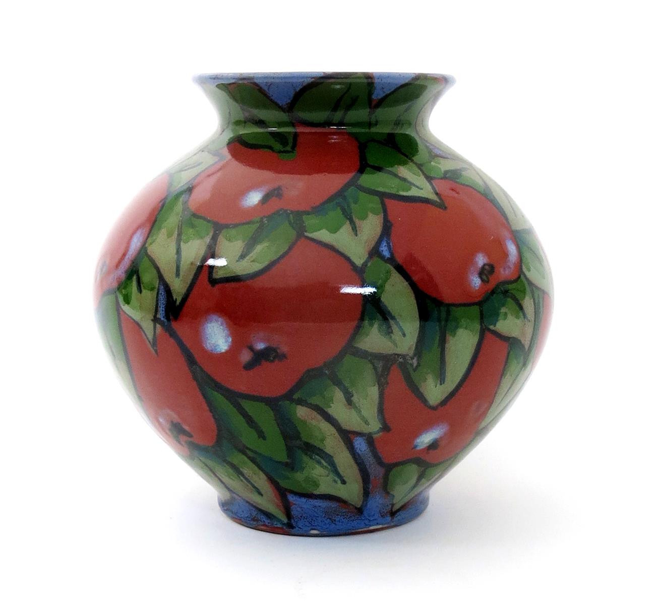 a Highland Stoneware vase, ovoid with everted top rim, painted with a frieze of apples, in red and green on a blue ground, printed factory mark, painted signature 21cm. high