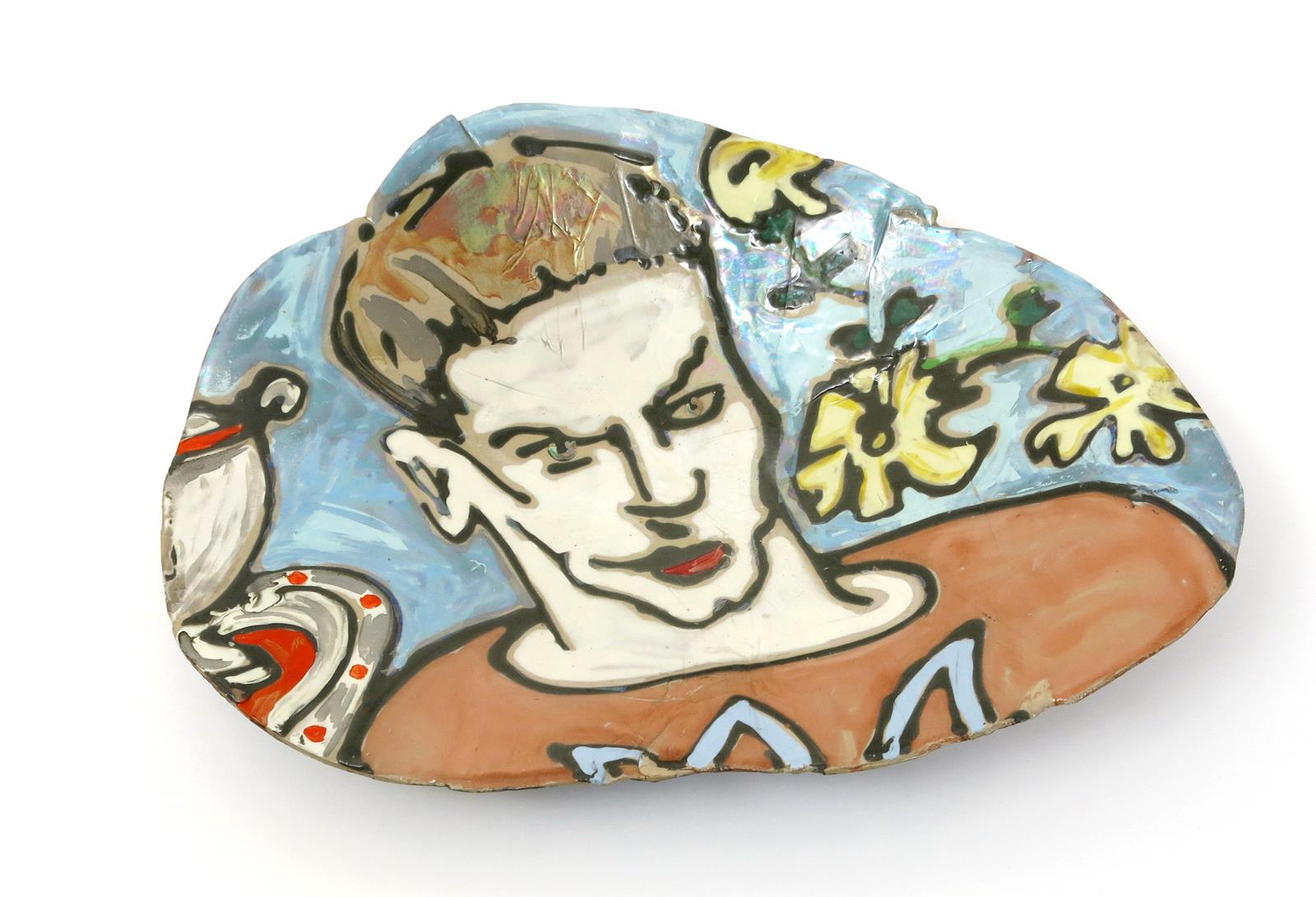 a freeform platter, painted to the front with a portrait of Chris, the reverse with a portrait of a woman, with metallic glazes, painted JS monogram, 50cm. wide.