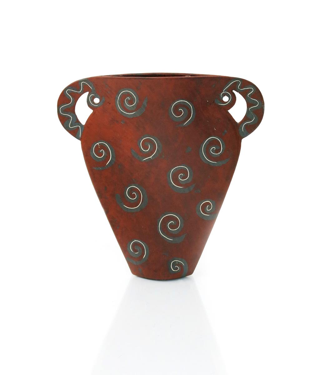 urn, a slender twin-handled vase painted with swirls in grey and white on a rust ground, incised signature to base, 22.5cm. high