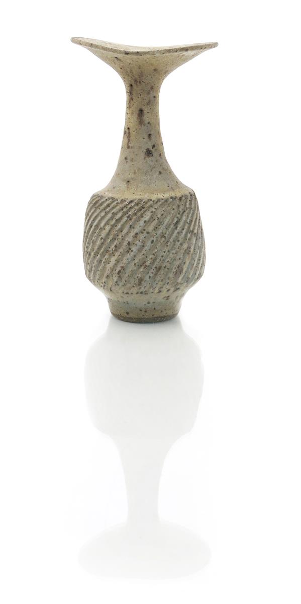 a stoneware bottle vase with flaring rim, the ovoid body with incised deep fluted, waisted cylindrical neck supporting broad undulating flaring rim, covered in a pitted oatmeal glaze with iron spots, impressed seal mark, 26cm. high