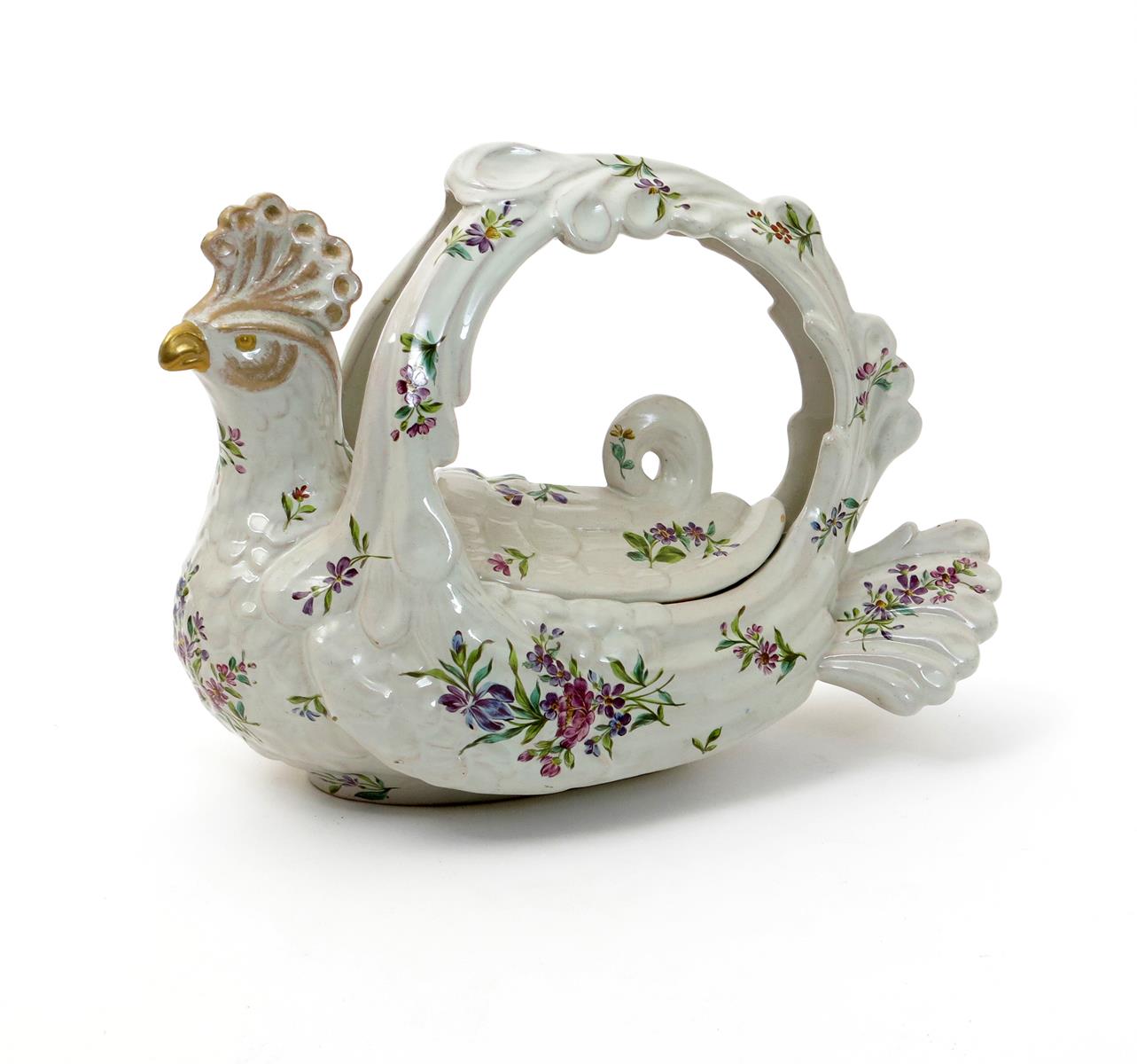 A Galle tin-glaze pottery basket and cover by Emile Galle, modelled as an exotic bird, the wings scrolling back to form a loop handle, painted with sprays of flowers in colours, highlighted in gilt, painted factory marks, Emile Galle signature to cover, minor glaze chips, 24cm. high (2)