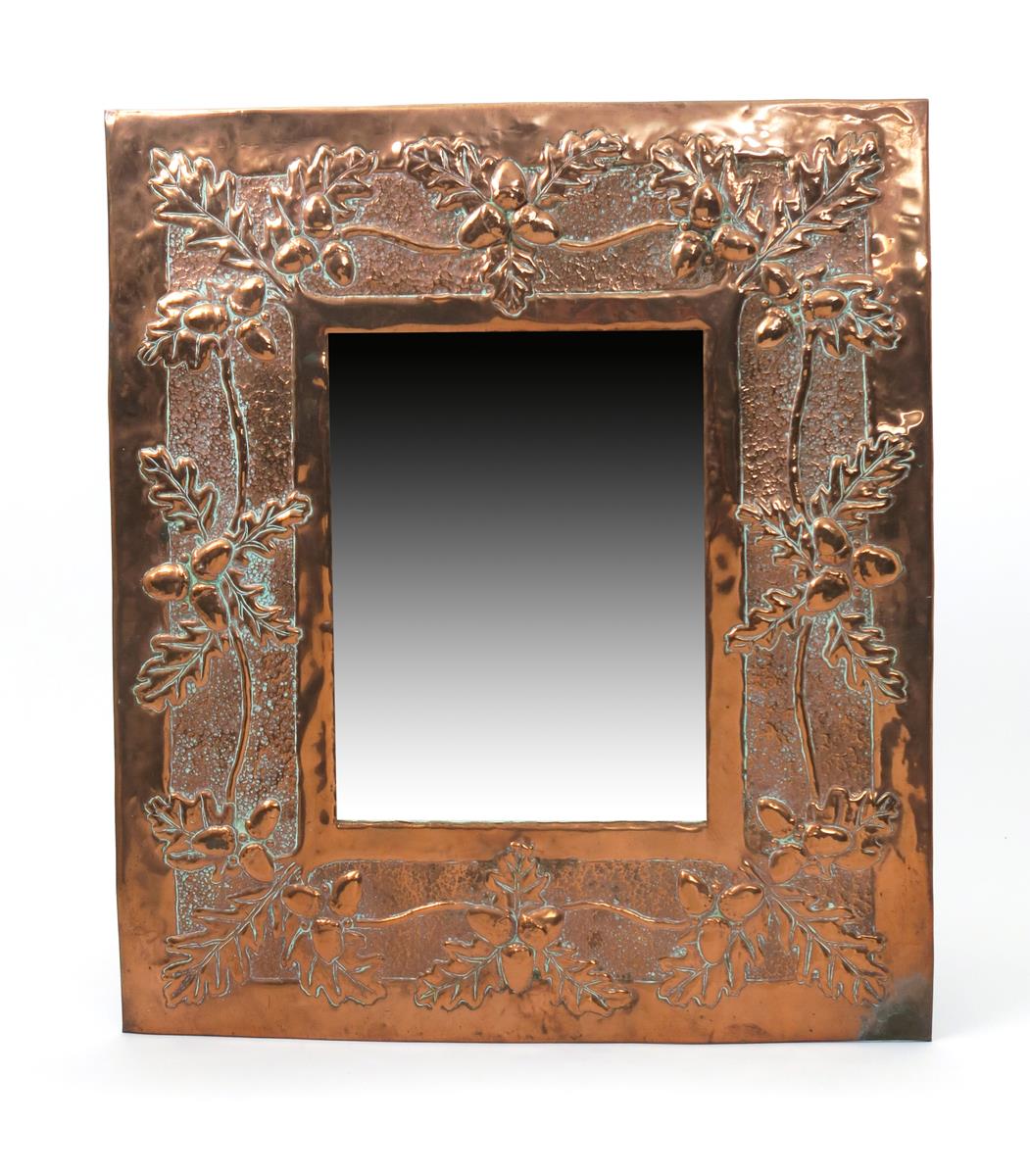 An Arts and Crafts copper wall mirror, rectangular, stamped in low relief with a frieze of acorns and oak leaf foliage, with bevelled mirror, unsigned 59.5 x 52cm.