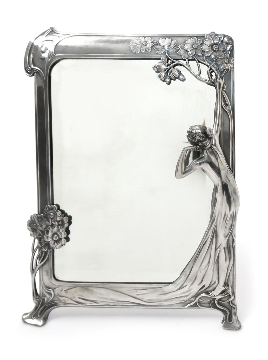 A large Art Nouveau W.M.F electroplated table mirror, model no.131, rectangular on easel back, cast in relief with an Art Nouveau maiden amongst flowers and foliage, gazing into the mirror, bevelled glass, cast mark to back, stamped marks to foot, 37cm. high