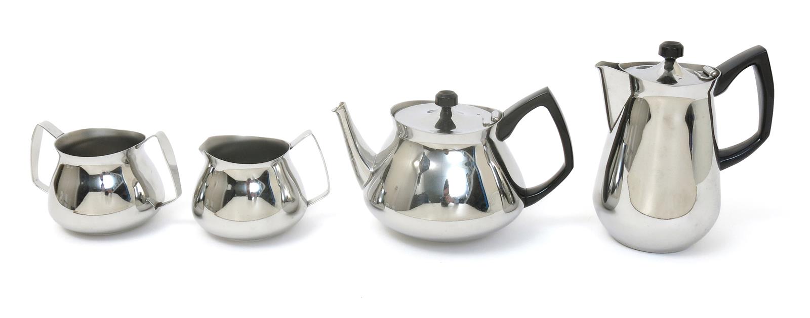 A Bramah stainless steel four piece tea set designed by Eric Clements, with black plastic handles and finials, comprising teapot and hinged cover, milk-jug and sugar basin, hot-water pot and hinged cover, stamped marks and some original paper labels, 12cm. high (tea pot), (4)