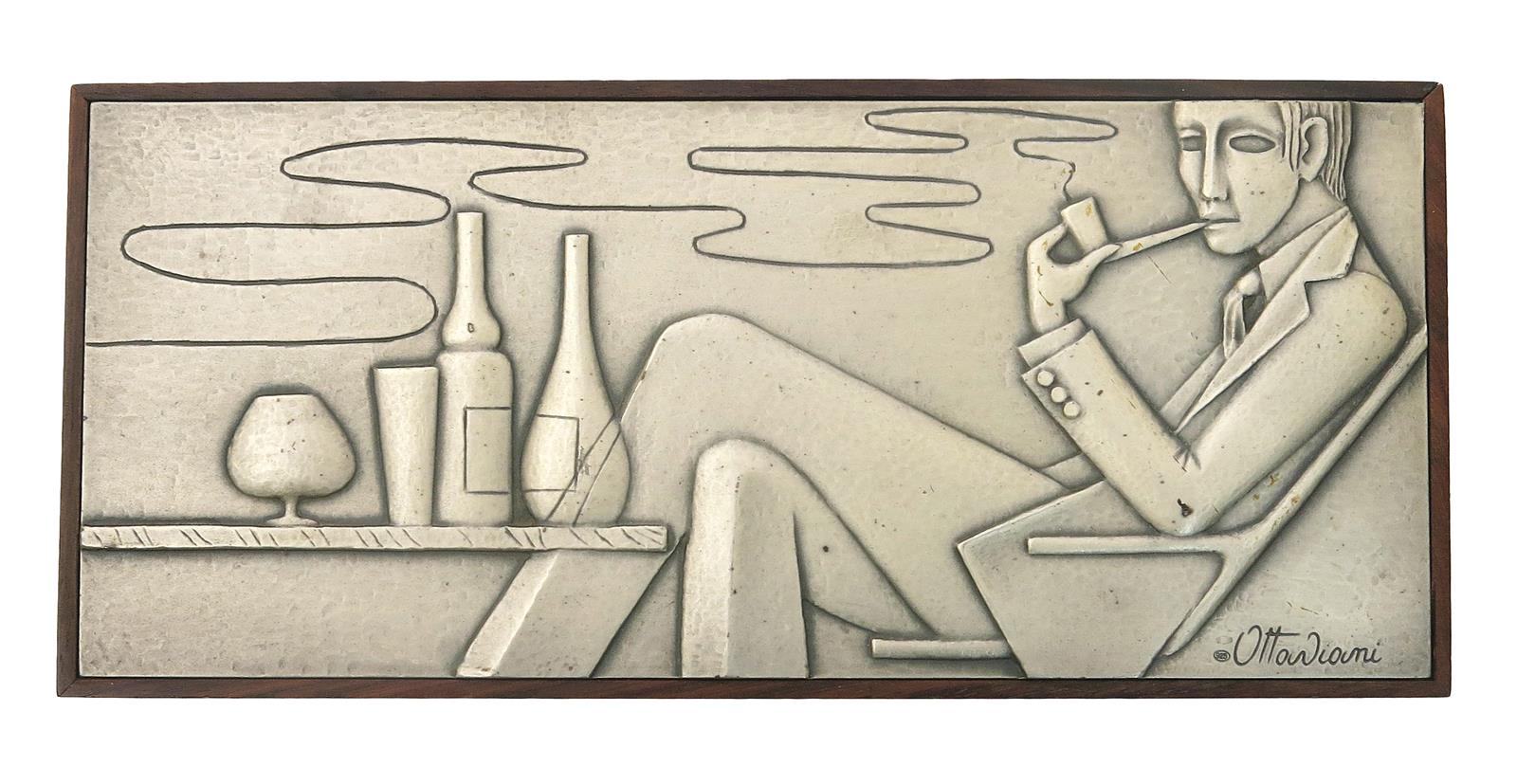 λ An Ottaviani silver mounted rosewood cigar box, rectangular with hinged cover, the silver plaque cast in low relief with a man smoking a pipe, next to a table with two bottles and a brandy balloon glass, signed in the cast Ottaviani, stamped 925, 24 x 10.5cm.