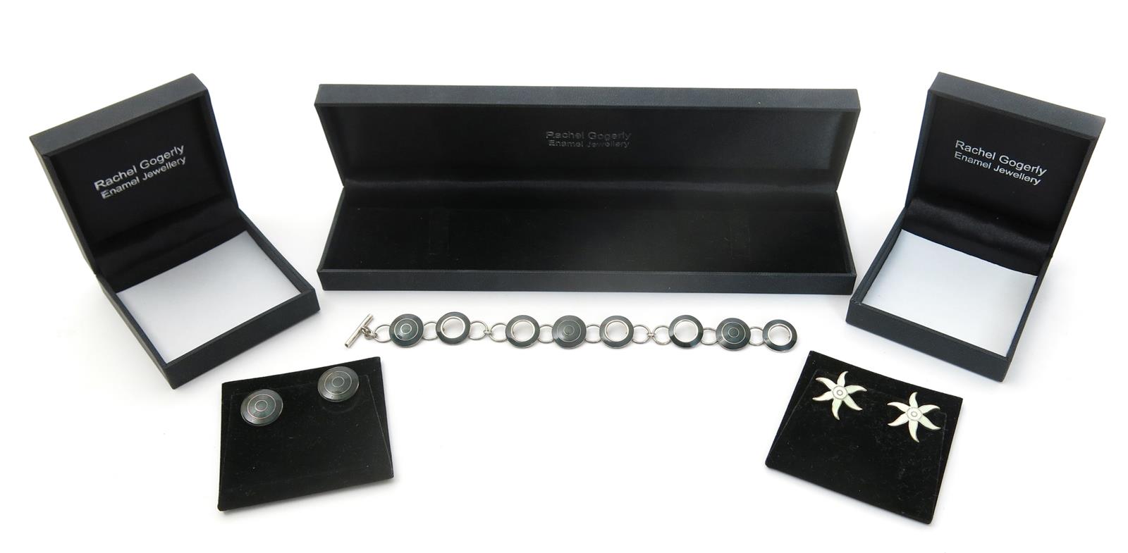 A Rachel Gogerly enamelled silver link bracelet, circles of green enamel with circular links, a pair of en suite earrings and another pair of Rachel Gogerly enamelled earrings modelled as star flowers, all in fitted presentation cases, cases signed, 18cm. wide (bracelet), (3)