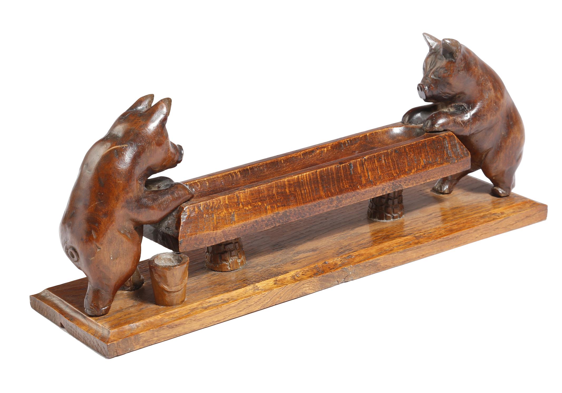 A treen pen tray, in the form of two pigs feeding at a trough, on an oak plinth, late 19th / early 20th century, 39.5cm long.