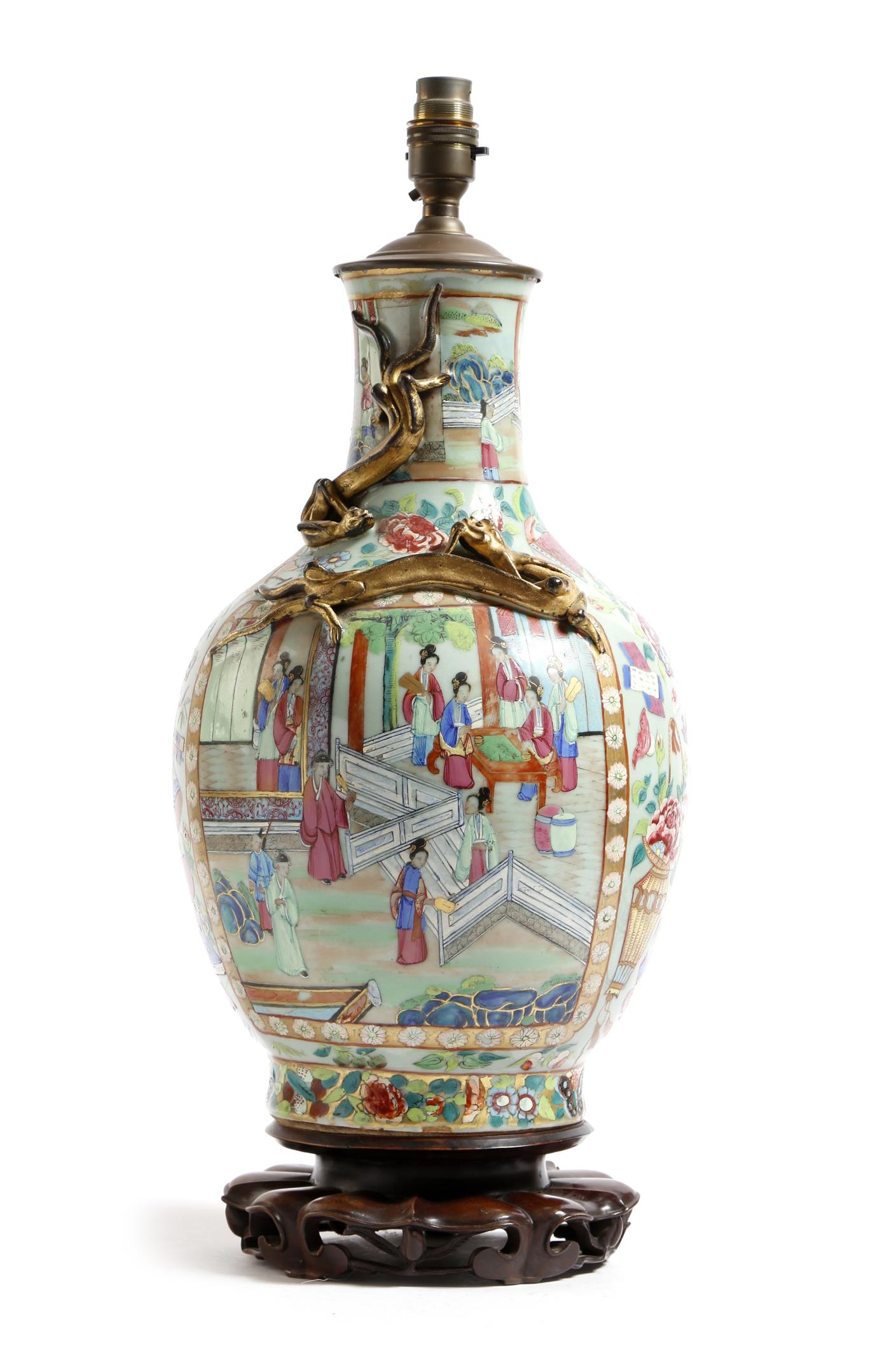 A 19th century Chinese Canton porcelain table lamp, with a celadon ground painted with panels of figures, with flowers, vases, gourds and books, applied with gilt chi dragons, on a hardwood base, 45.5cm high (excluding fittings).