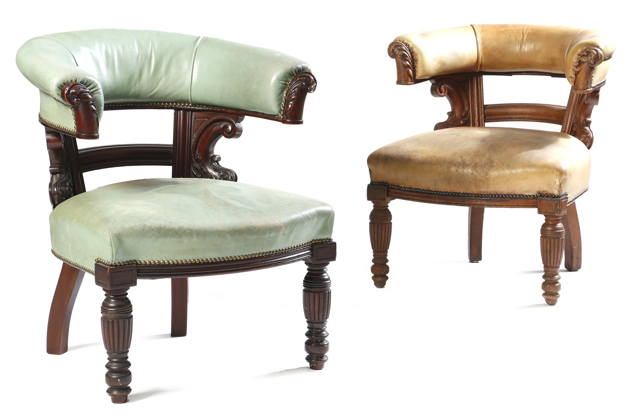 A Victorian mahogany library armchair, upholstered with green leather, the 'U'-shaped back above leaf scroll carved supports, on ribbed and turned tapering legs, together with a very similar chair in oak. (2)