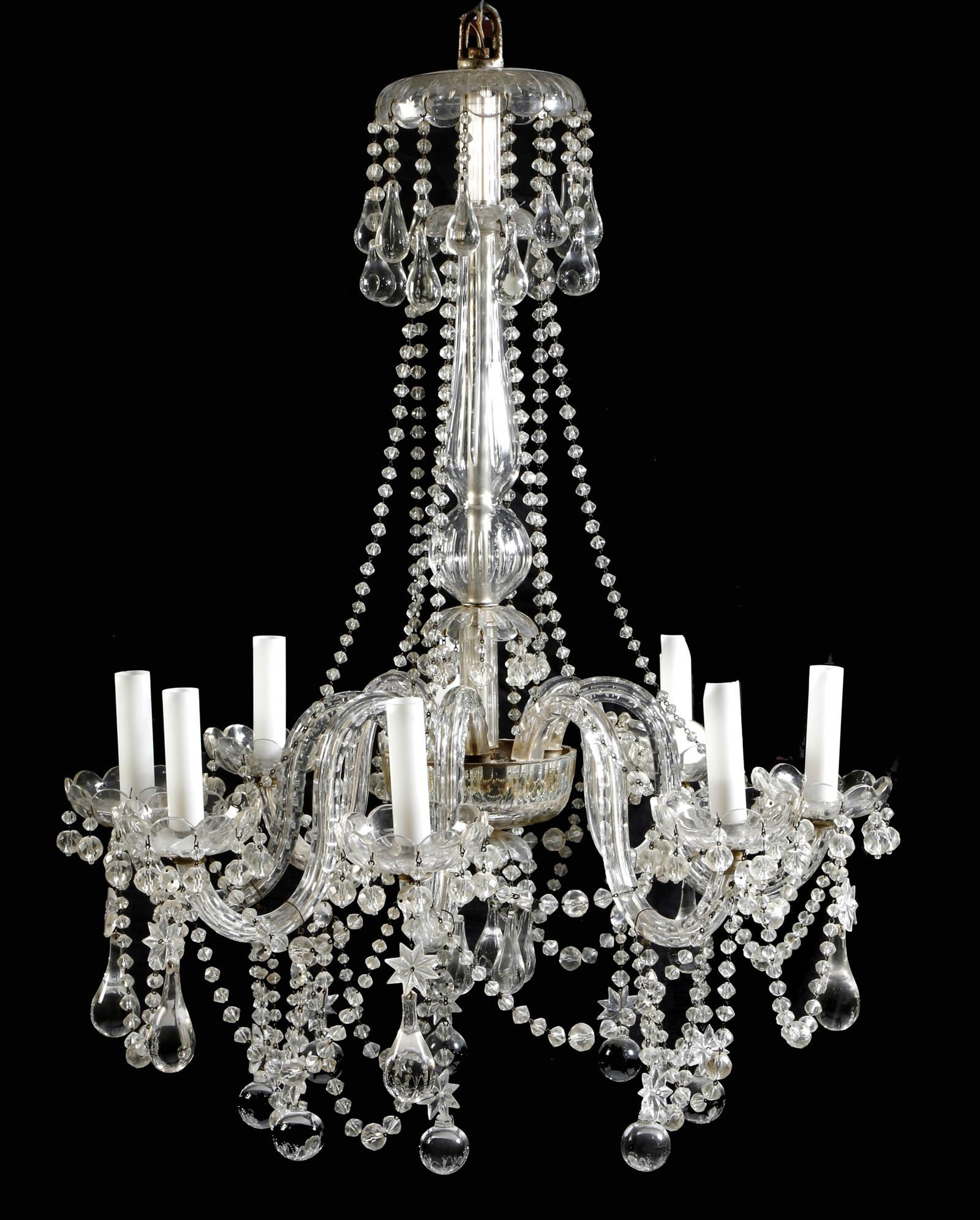 A Victorian cut glass eight-light chandelier, hung with pear, apple and diamond shape drops and with star prunts, the baluster and ball stem, with scroll arms and petal shape drip-pans, 91cm high, 69.5cm wide.