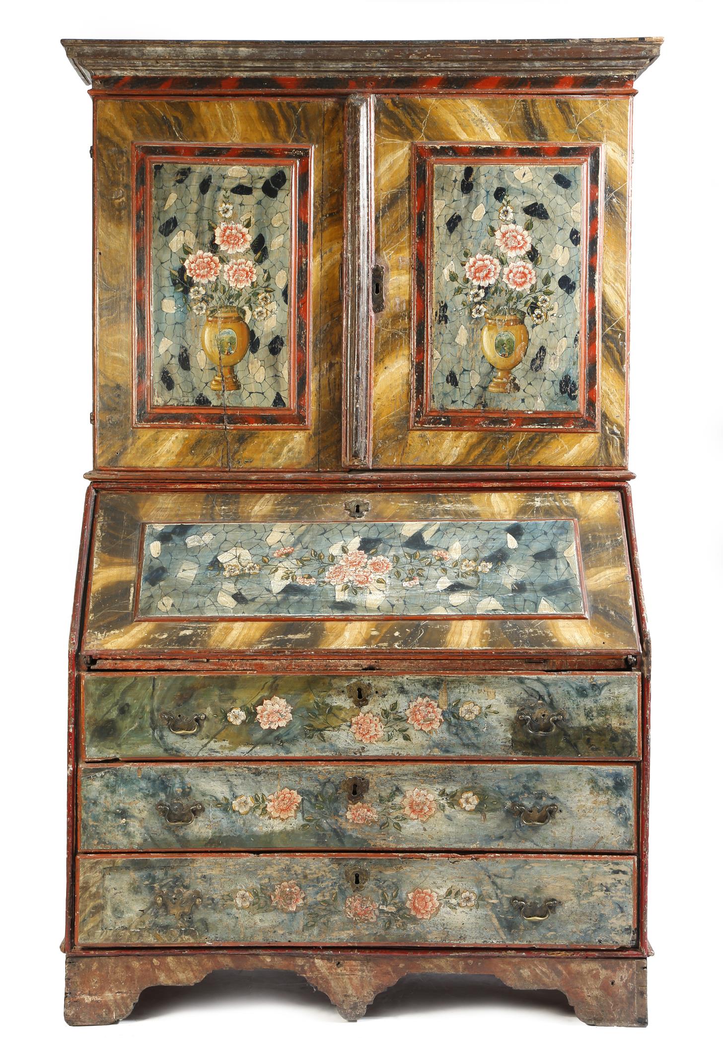 An 18th century Portuguese painted bureau cabinet, with faux marble decoration, with a pair of raised panelled doors decorated with urns of flowers, enclosing shelves, the conforming base with a hinged fall with pigeon holes and drawers and three further long drawers on bracket feet, 203.5cm high, 128.3cm wide, 64.4cm deep.