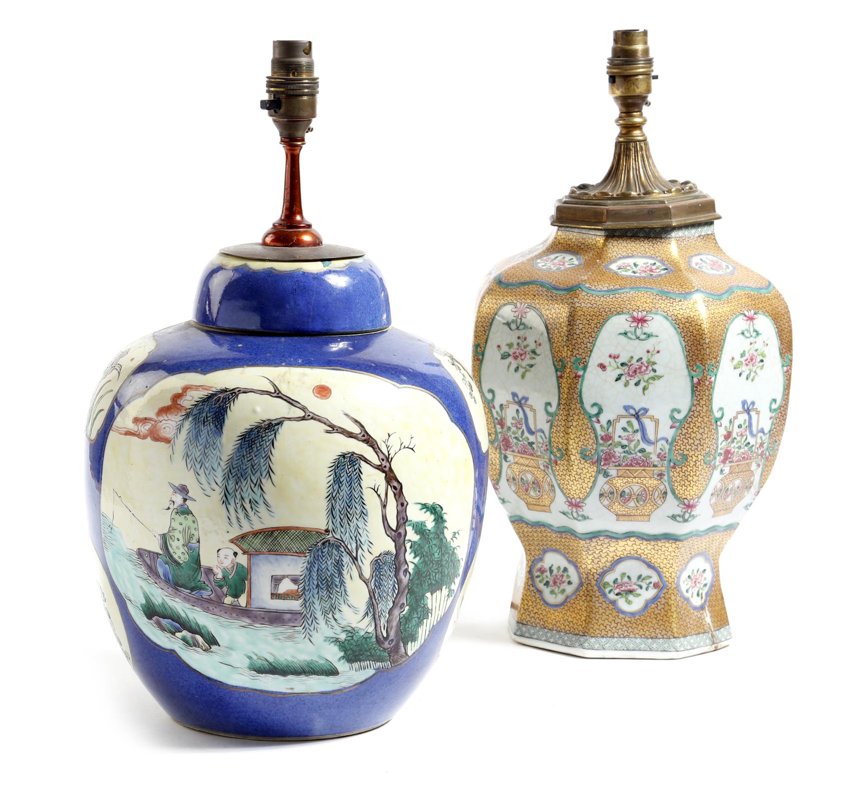 A Chinese porcelain famille rose table lamp, of octagonal baluster form, painted with panels of flowers, on a diaper gilt ground, together with a Chinese ginger jar table lamp, 36cm high. (2)