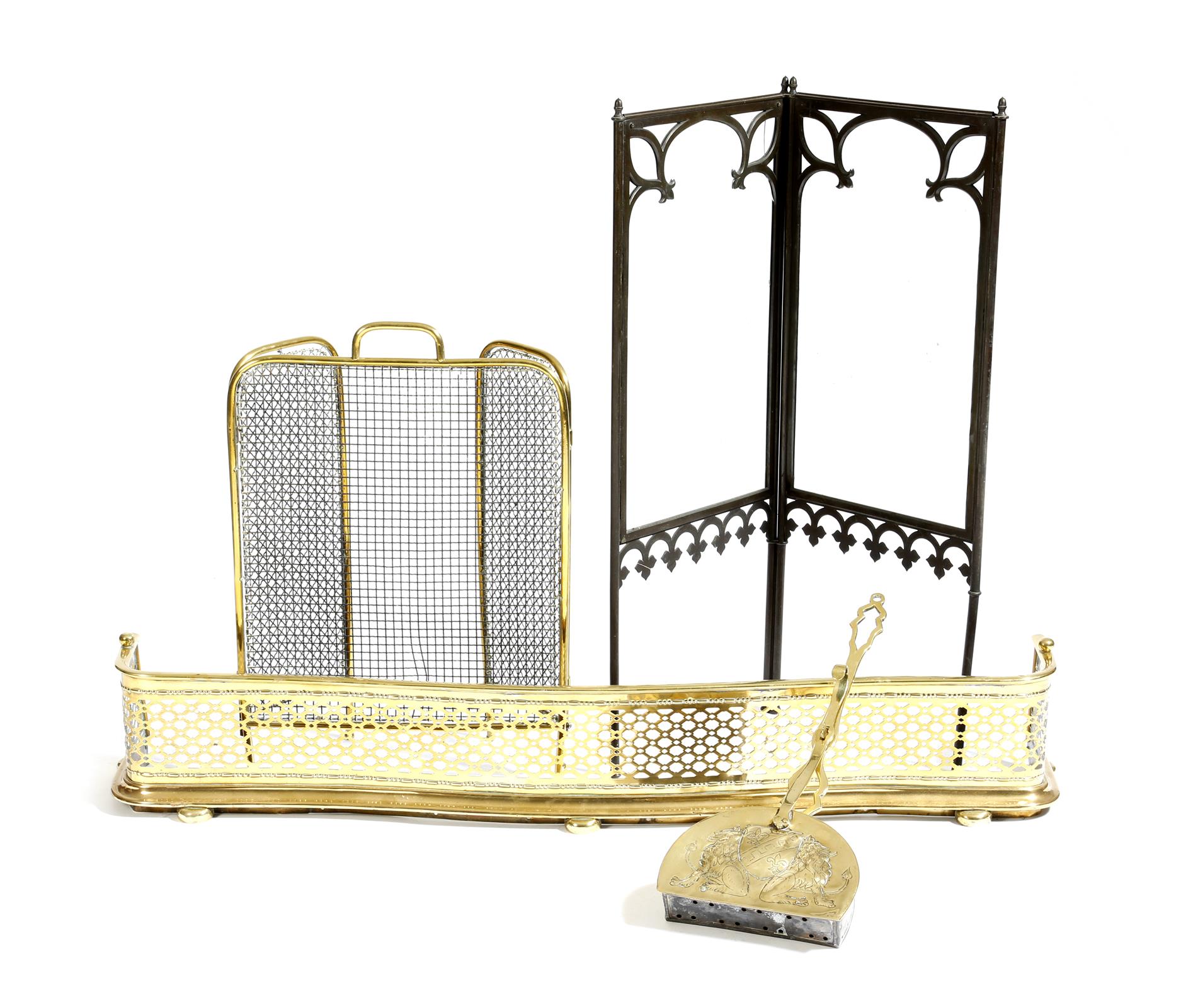 A Victorian brass serpentine fender, with pierced lattice decoration, a brass and wirework triptych fireguard, a bronze and glass Gothic style folding firescreen and a brass warming pan, repousse decorated with a pair of lions flanking a coat of arms, 126cm (max). (4)