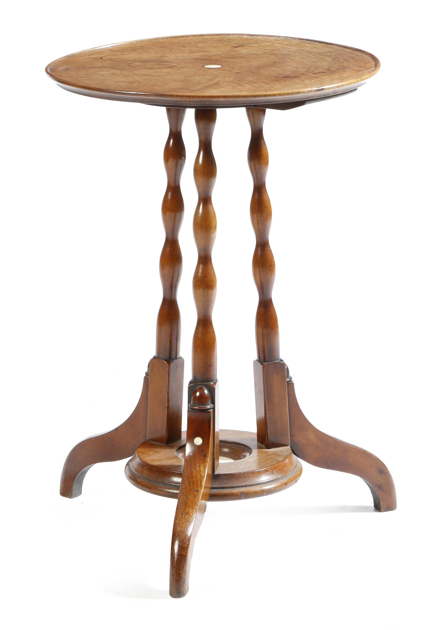 λ A Victorian walnut occasional table, inlaid with ivory rondels, with a circular dished top, on a tripod base, 66.4cm high, 48cm wide.