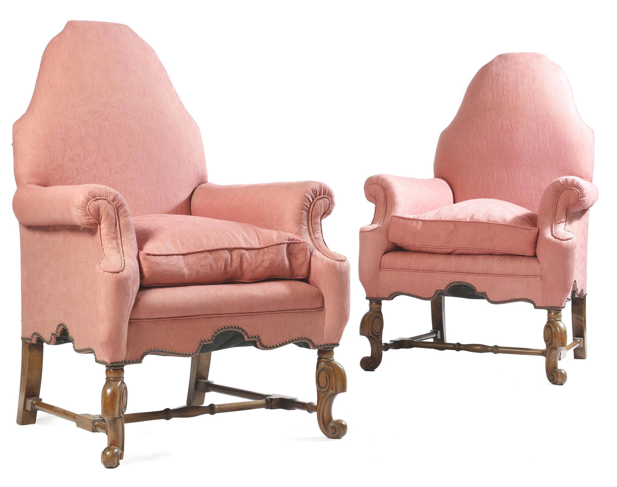 A pair of walnut wing armchairs in William & Mary style, each with studded pink upholstery, on cabriole front legs united by stretchers. (2)