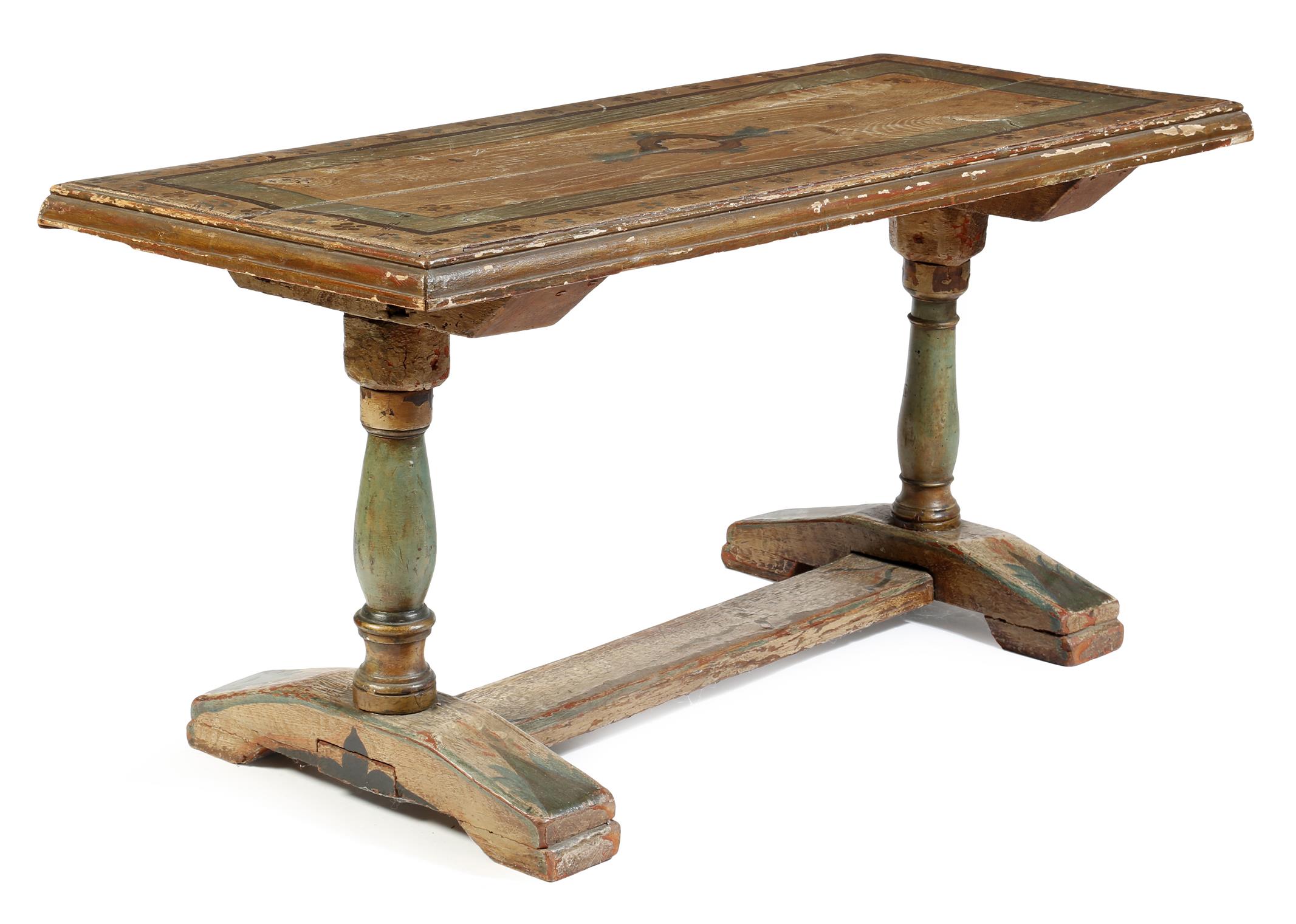 An 18th century Austrian painted wood tavern table, decorated with flowers and leaves, on baluster turned ends united by a central stretcher, 66.3cm high, 135cm wide, 58cm deep.