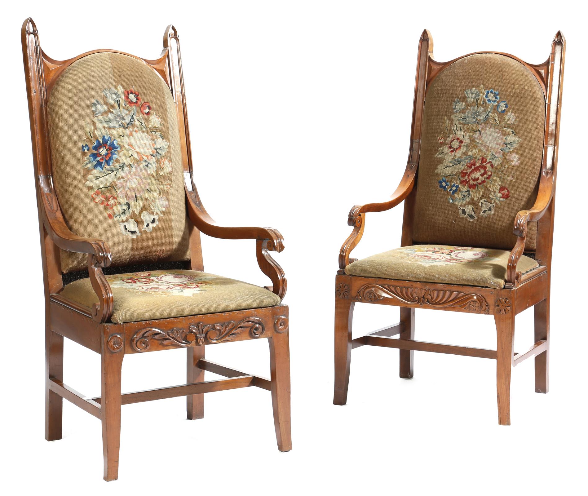 Two similar 19th century continental fruitwood Gothic armchairs, each with a padded needlework back and seat. (2)
