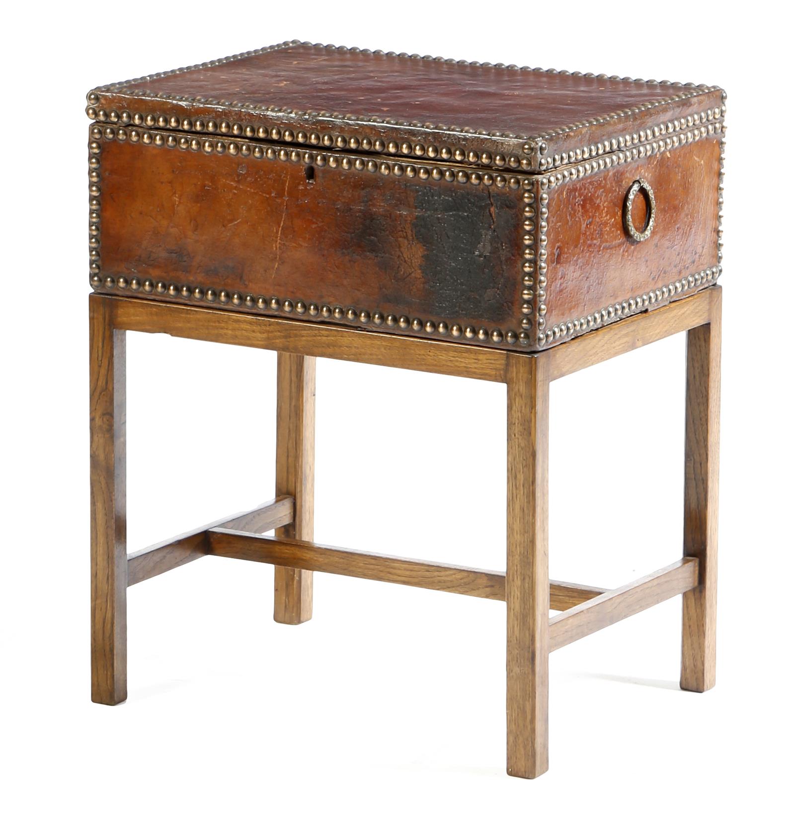 A brass studded brown leather chest on stand, with a vacant interior and ring side handles, 57.9cm high, 46.5cm wide, 36cm deep.