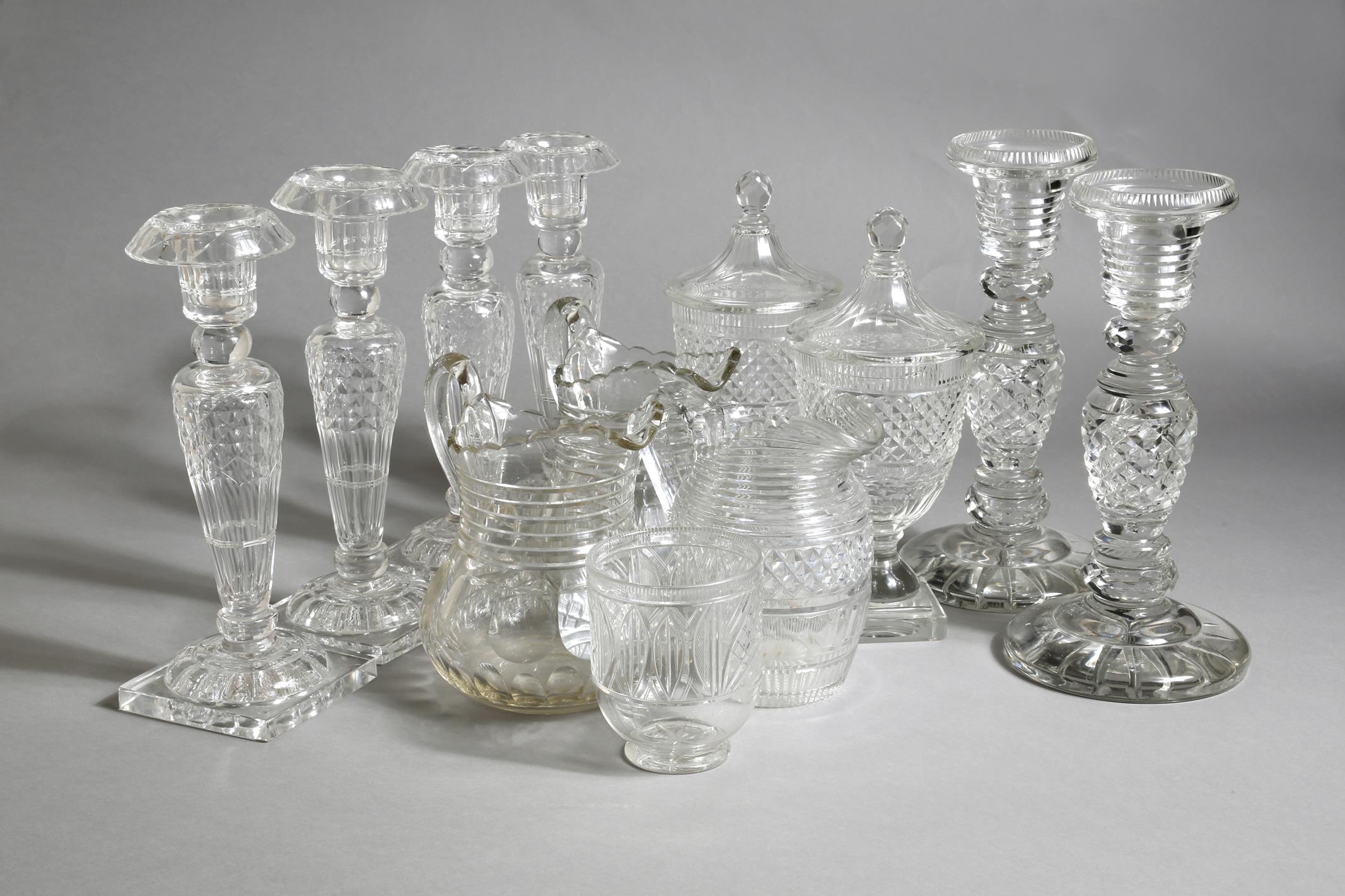 A collection of glassware, comprising: a good pair of Victorian cut glass candlesticks, a pair of cut glass sweetmeat jars and covers, a set of four candlesticks, three jugs and a beaker, 19th century and later, 30.7cm high (max). (12)