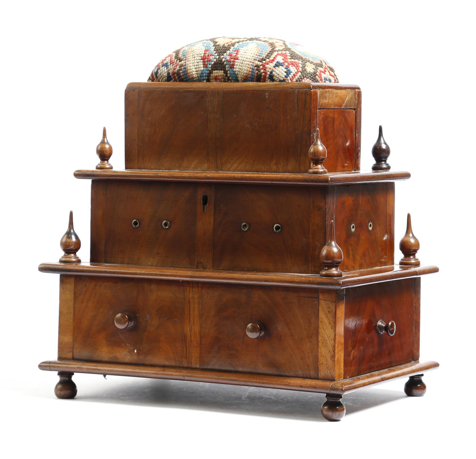 λ A Victorian mahogany and rosewood sewing box, of graduated stepped form, the hinged top with a needlework pin cushion and with two drawers, the underside of the lid with a fret panel with initials 'A V' and the date '1862', revealing reel holders and with apertures for the thread, the base with two further drawers with false fronts, on bun feet, 32.2cm high, 29.4cm wide.