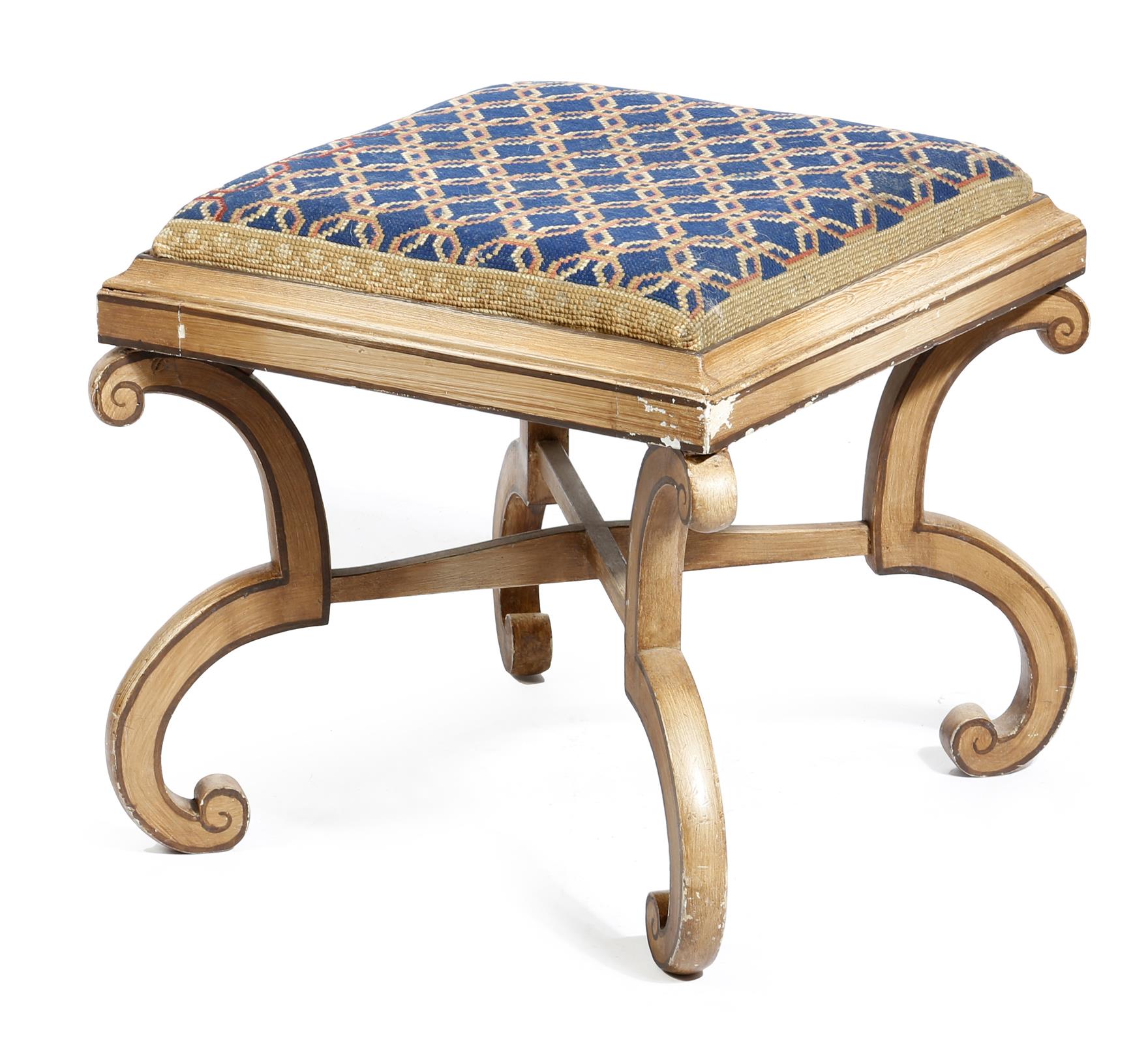 A 19th century painted wood stool, with a tapestry drop-in seat on scroll supports, 47.7cm high, 50cm wide, 51cm deep.