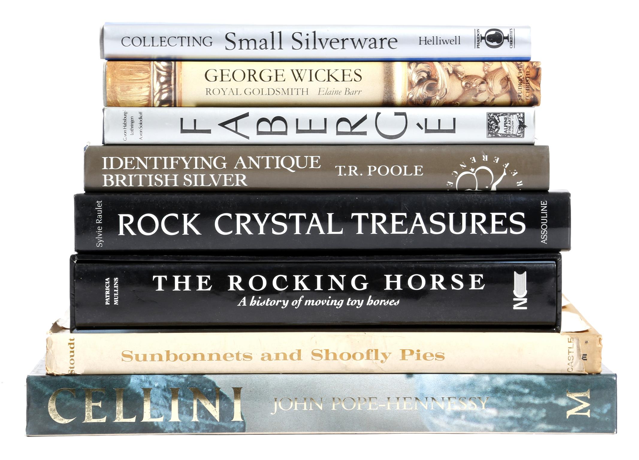Literature. A quantity of books relating to silver and antiques, including: John Pope-Hennessy 'Cellini', Sylvie Raulet 'Rock Crystal Treasures', Stephen Helliwell 'Collecting Small Silverware', G. von Habsburg-Lothringen and A. von Solodkoff 'Faberge: Court Jewellers to the Tsars' and Patricia Mullins 'The Rocking Horse: A history of moving toy horses'. (A lot)