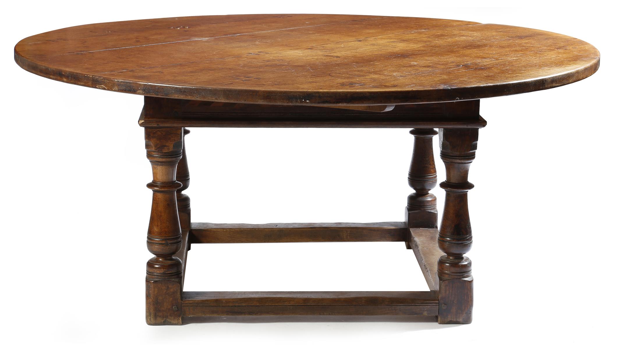 An oak dining table in 17th century style, the circular top above a parquetry decorated frieze, on baluster turned legs united by peripheral stretchers, 77.3cm high, 182.3cm diameter.