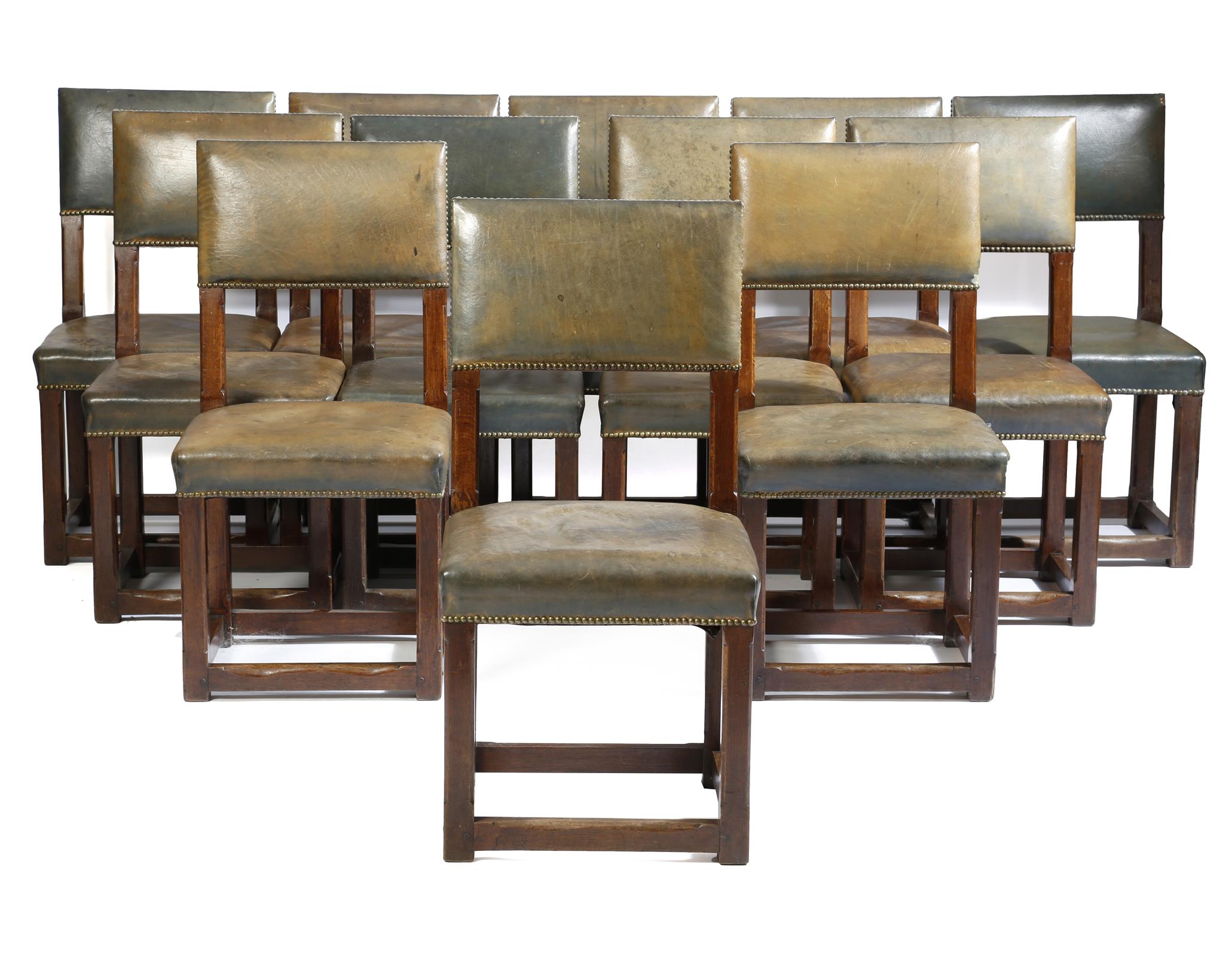 A set of twelve 19th century oak and green leather dining chairs in the manner of Pugin, each with a studded and padded back and seat, on chamfered legs united by peripheral stretchers. (12)