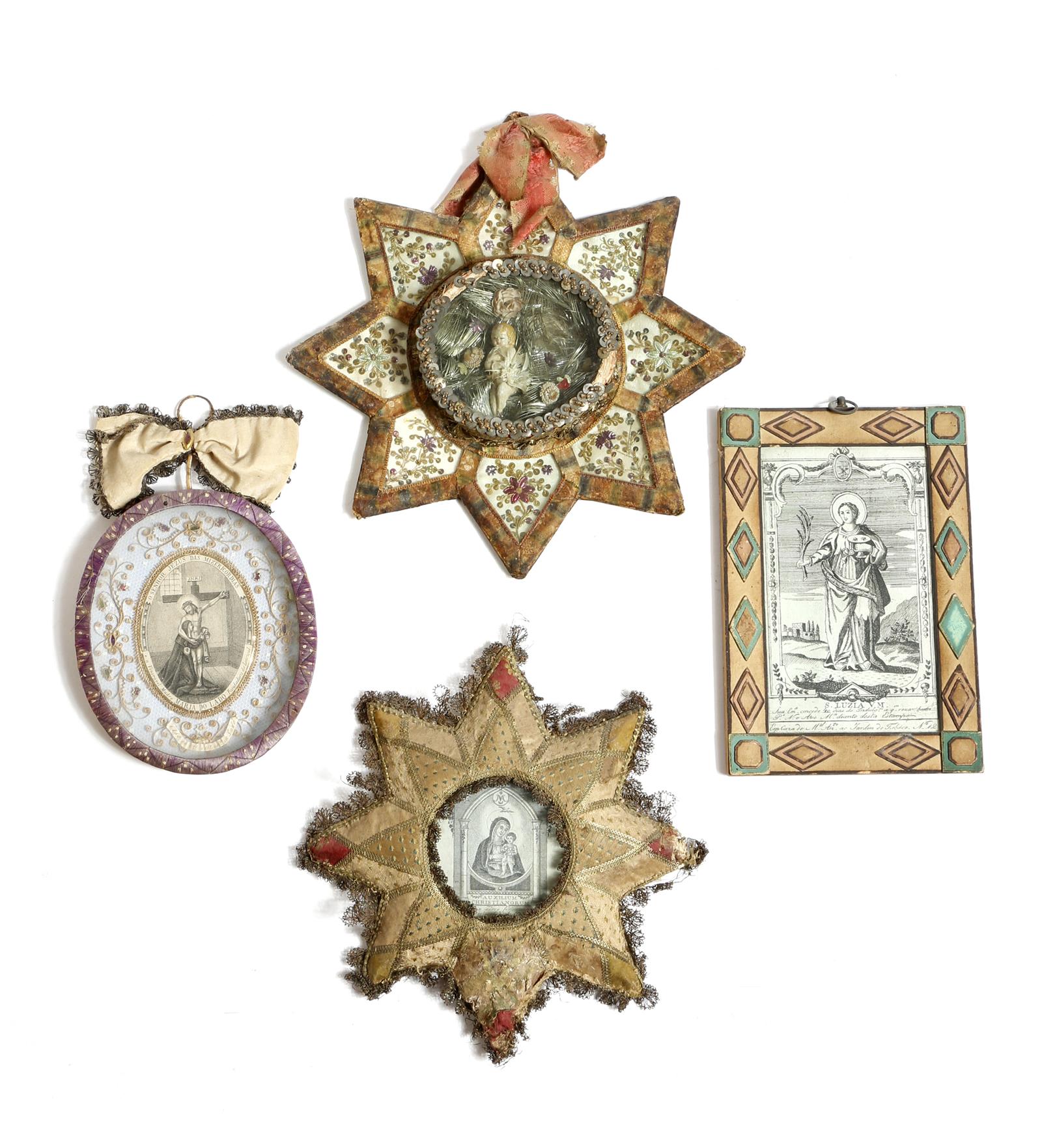 Four Portuguese Catholic devotional wall hangings, three decorated with needlework frames, one with paper scroll filigree decoration and devoted to Maria Do Lado, two of star shape, one decorated with spangles, the other with a painted card frame with an engraving of S. Luzia, probably late 18th / early 19th century, 24cm (max). (4)