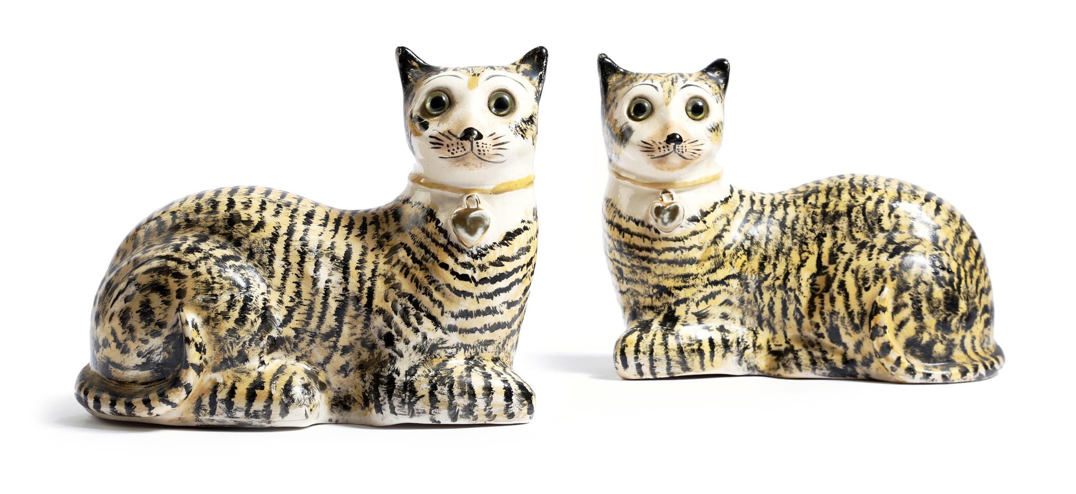 A pair of late Victorian Staffordshire pottery models of recumbent cats