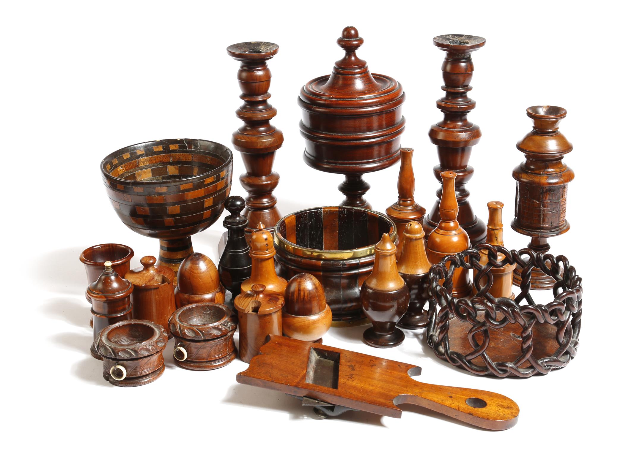 A collection of treen, including: a 19th century cup and cover, a specimen wood parquetry bowl, a specimen wood coaster of staved construction, possibly Scottish, a pair of Victorian yew candlesticks, various boxwood sprinklers and sifters, one dated '1907', an egg cup, an olivewood cup and cover from the Holy Land, carved with buildings, condiments, a ropetwist coaster and a plane by 'E. Preston & Sons', 24cm high (max). (22)