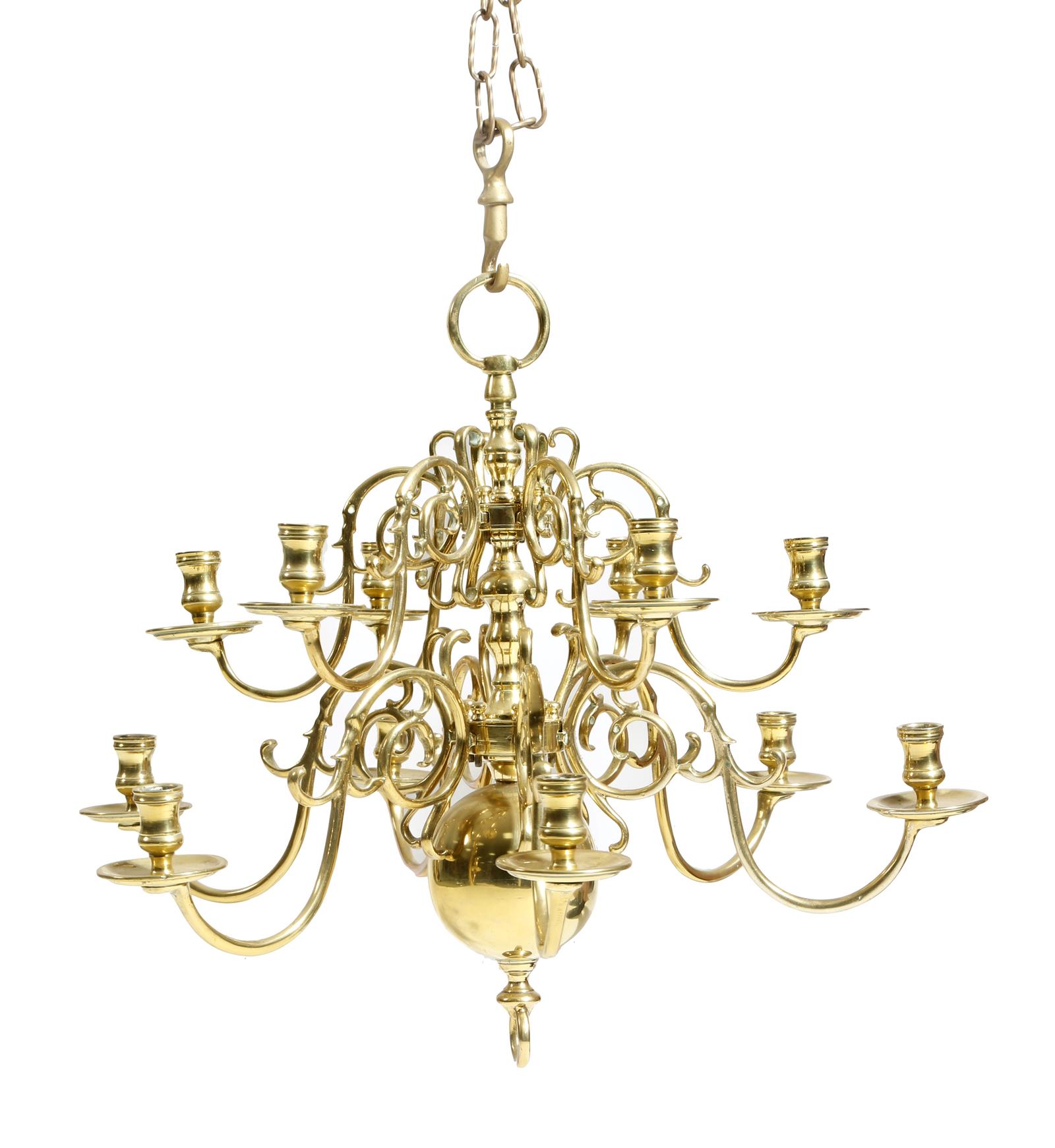 An 18th century Dutch brass twelve-light chandelier