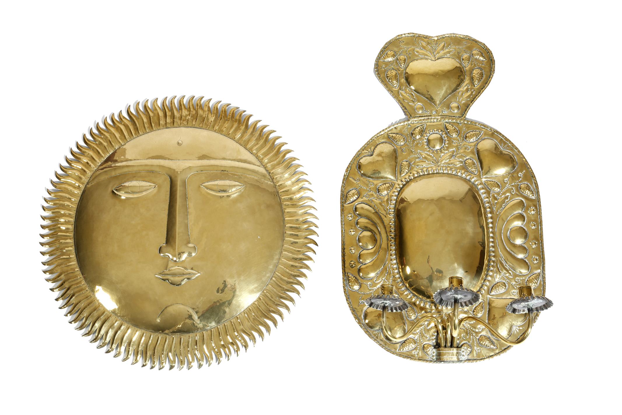 A 19th century Dutch brass three-light wall sconce, with repousse decoration, together with a Sri Lankan brass repousse sun plaque, 74cm high (max). (2)