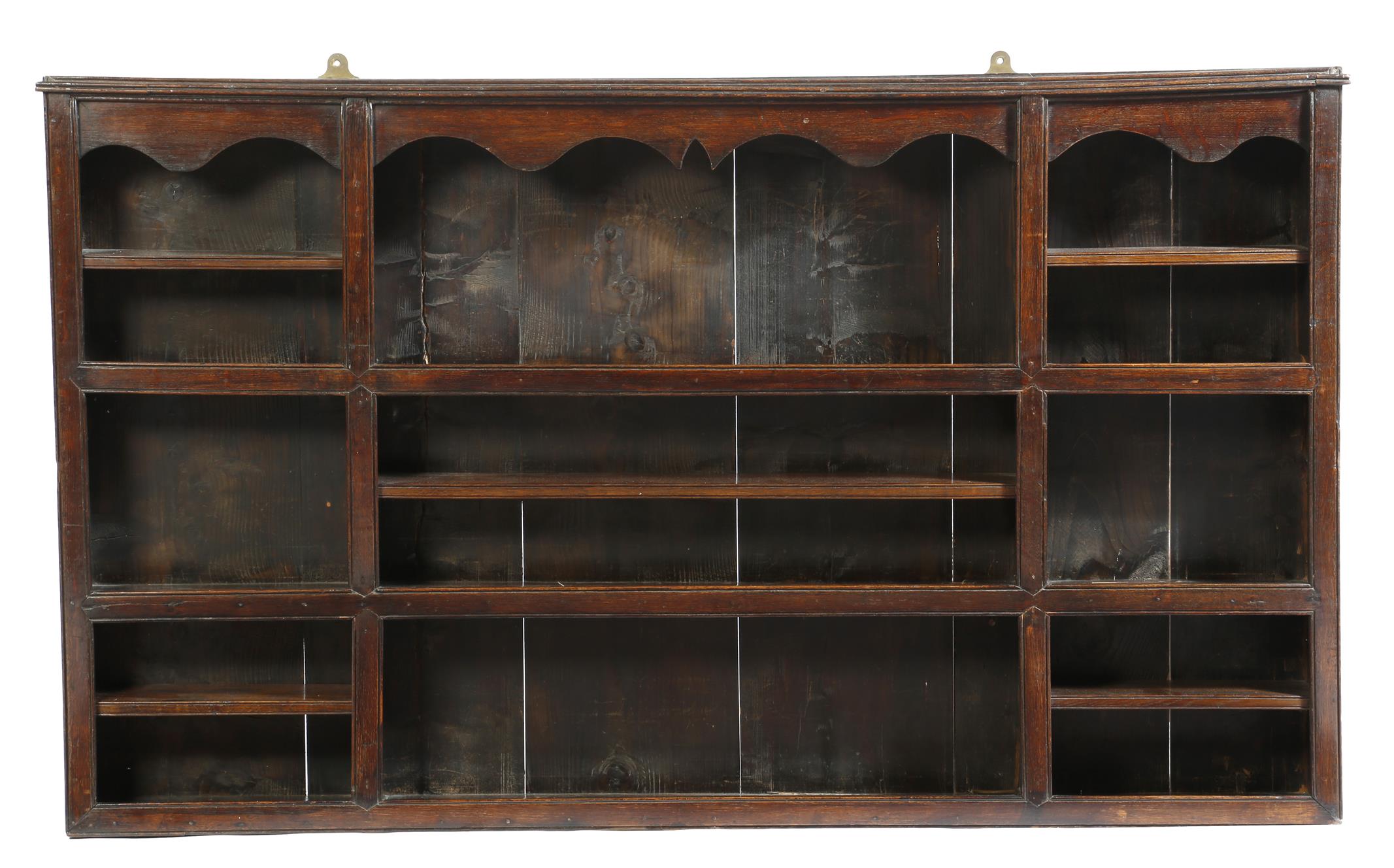 An oak plate rack, with a shaped frieze above an arrangement of shelves, late 18th / early 19th century, 91.5cm high, 155.5cm wide, 13.5cm deep.