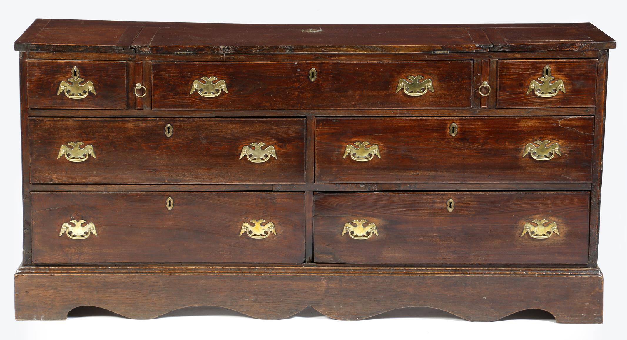 An unusual 18th century ash clerk's chest, the top with a hinged writing slope, above an arrangement of seven drawers, on shaped bracket feet, 73.5cm high, 152.6cm wide, 40.5cm deep.