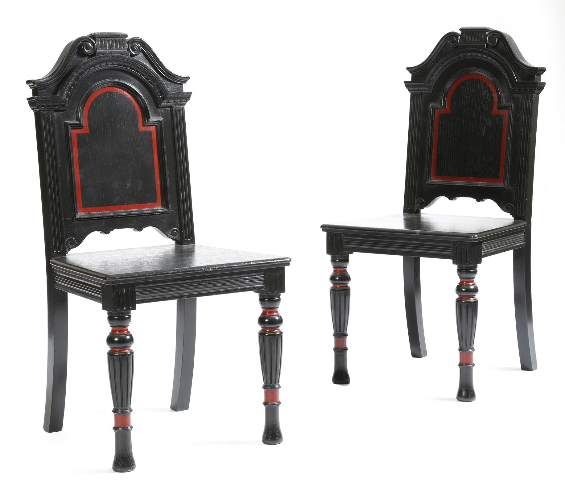 A pair of ebonised hall chairs, with red painted highlights, each with an architectural panelled back, on fluted front legs, late 19th / early 20th century. (2)