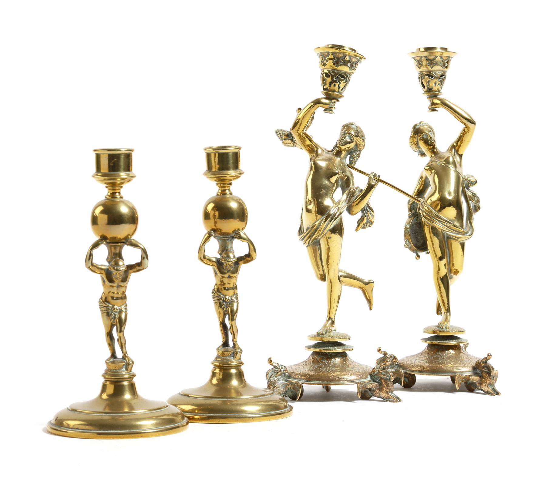 A pair of 19th century brass figural candlesticks, the stem modelled with Atlas supporting Earth and a sconce, together with another pair of brass figural candlesticks, 27.2cm high (max). (4)